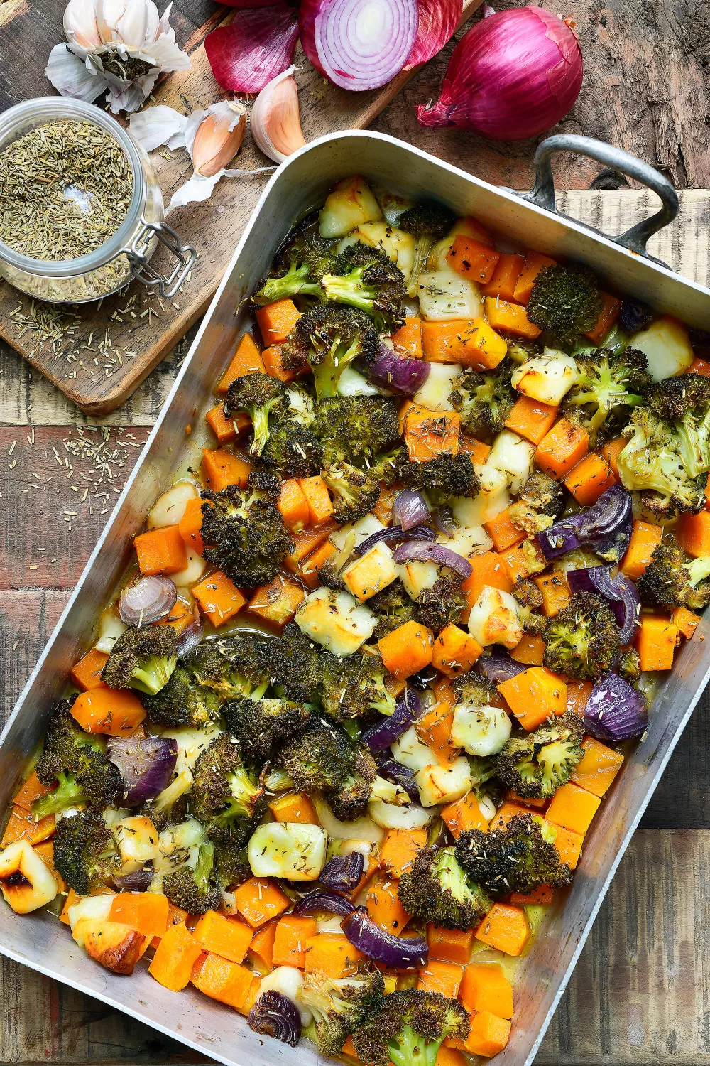 Een kleurrijke traybake met krokante halloumi en zoete butternutpompoen, geroosterd met broccoli en rode ui voor een warme, hartige smaak. De simpele marinade van knoflook, olijfolie, tijm, rozemarijn en een scheutje honing zorgt voor mediterrane tonen en licht gekarameliseerd randje. Perfect als makkelijke vegetarische maaltijd doordeweeks of als bijgerecht bij een herfst of winterdiner, klaar in ongeveer 30 minuten in de oven.