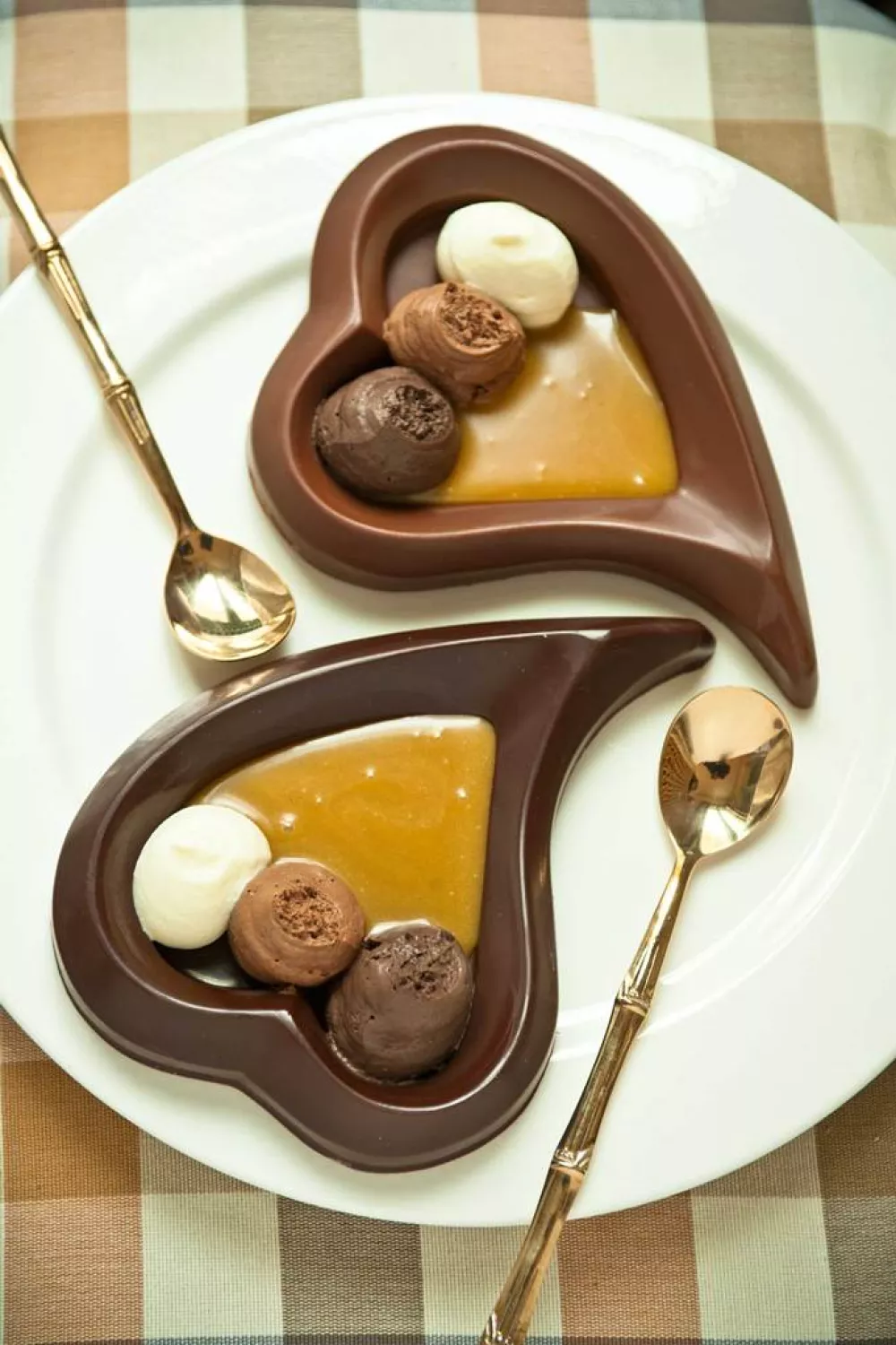 Serveer de trio van chocolademousse samen met de ketjapsaus (eventueel in een hartjesvormpje voor een extra feestelijke toets).