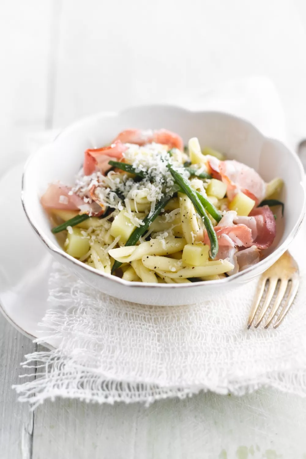 Verdeel de trofie over de warme pastaborden. Leg de plakjes speck op de warme pasta. Schaaf er aan tafel de Parmezaanse kaas over.