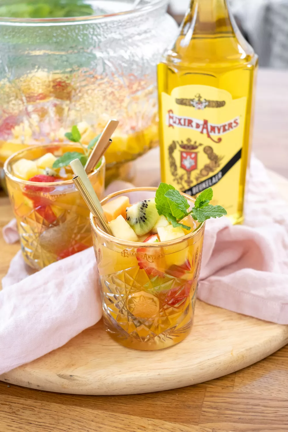 Schil het fruit (behalve de aardbeien) en snijd het in stukjes. Doe de stukjes in een grote karaf en overgiet ze met het multivruchtensap, de witte wijn en de Elixir d’Anvers. Laat een uurtje trekken in de koelkast zodat alle smaken zich kunnen vermengen.