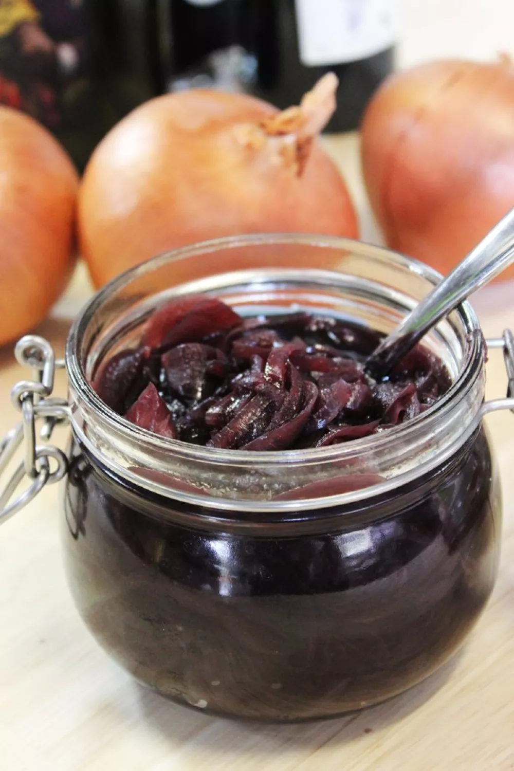 Tip:Deze uienconfituur kan je enkele weken afgesloten bewaren in de koelkast.