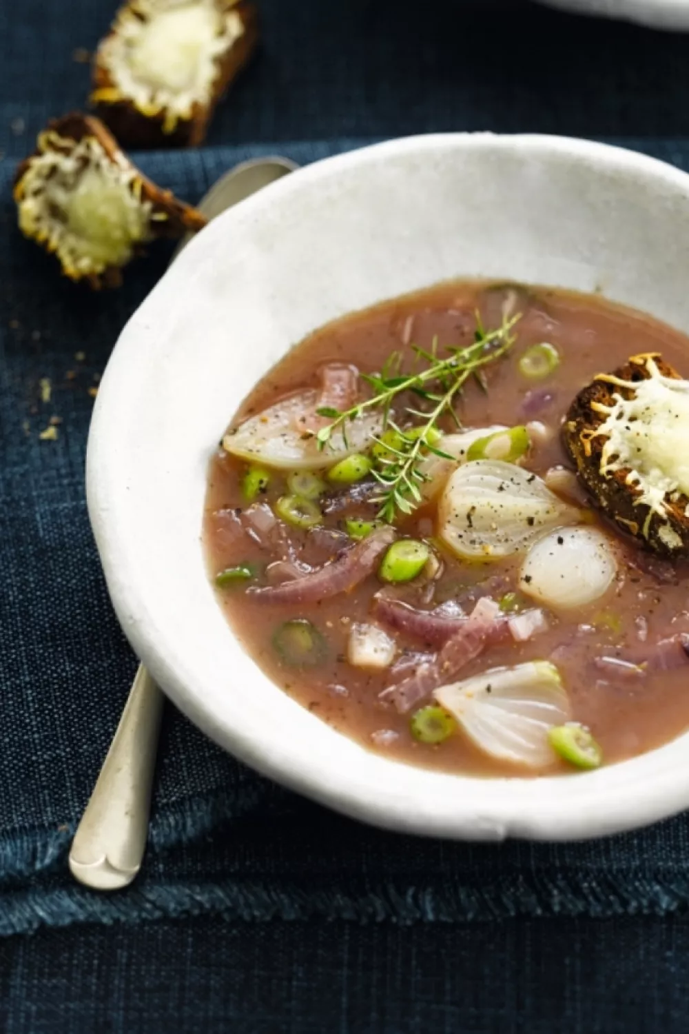 Romige uiensoep met goudbruine gekarameliseerde uien, frisse kruiden als rozemarijn en tijm en een vleugje witte porto voor extra diepte. De uien worden langzaam gebakken, geblust met bouillon en op smaak gebracht met balsamico en worcestershiresaus, waarna sneetjes brood met gesmolten gruyère er bovenop gaan voor een klassieke gratiné. Heerlijk als verwarmend voorgerecht bij herfst- en wintermaaltijden.