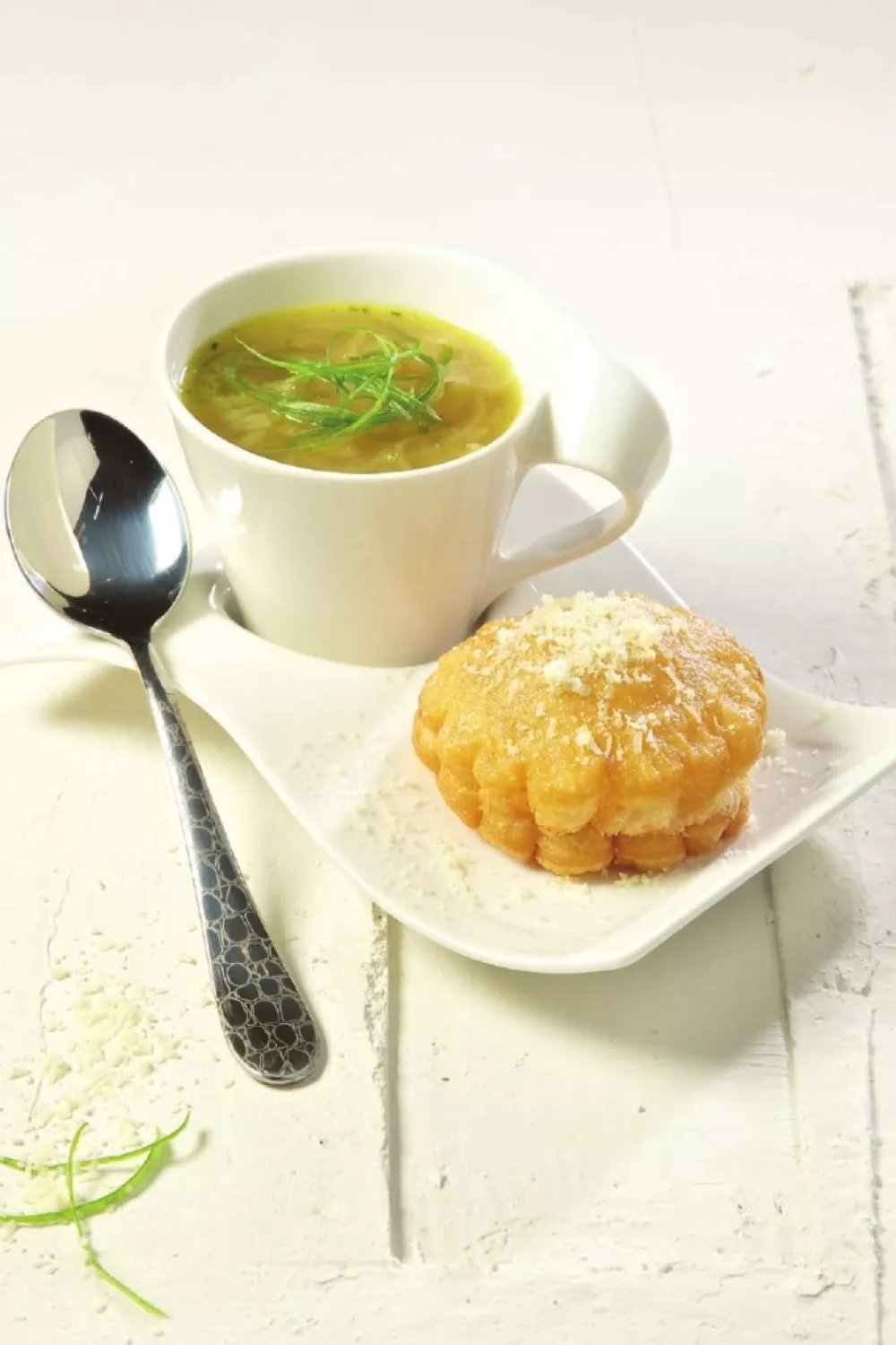 Warme uiensoep met een diepe kippenbouillon en gekaramelliseerde uien, afgewerkt met knapperige kaasjasjes van zelfgemaakt bladerdeeg gevuld met mozzarella en Parmezaanse kaas. De smaak krijgt zijn karakter door lang trekken van de bouillon en het zacht stoven van uien met sherryazijn en witte wijn. Ideaal als gezellige winterse comfortmaaltijd of weekendproject voor liefhebbers van klassieke Franse keuken en bladerdeegtechnieken.