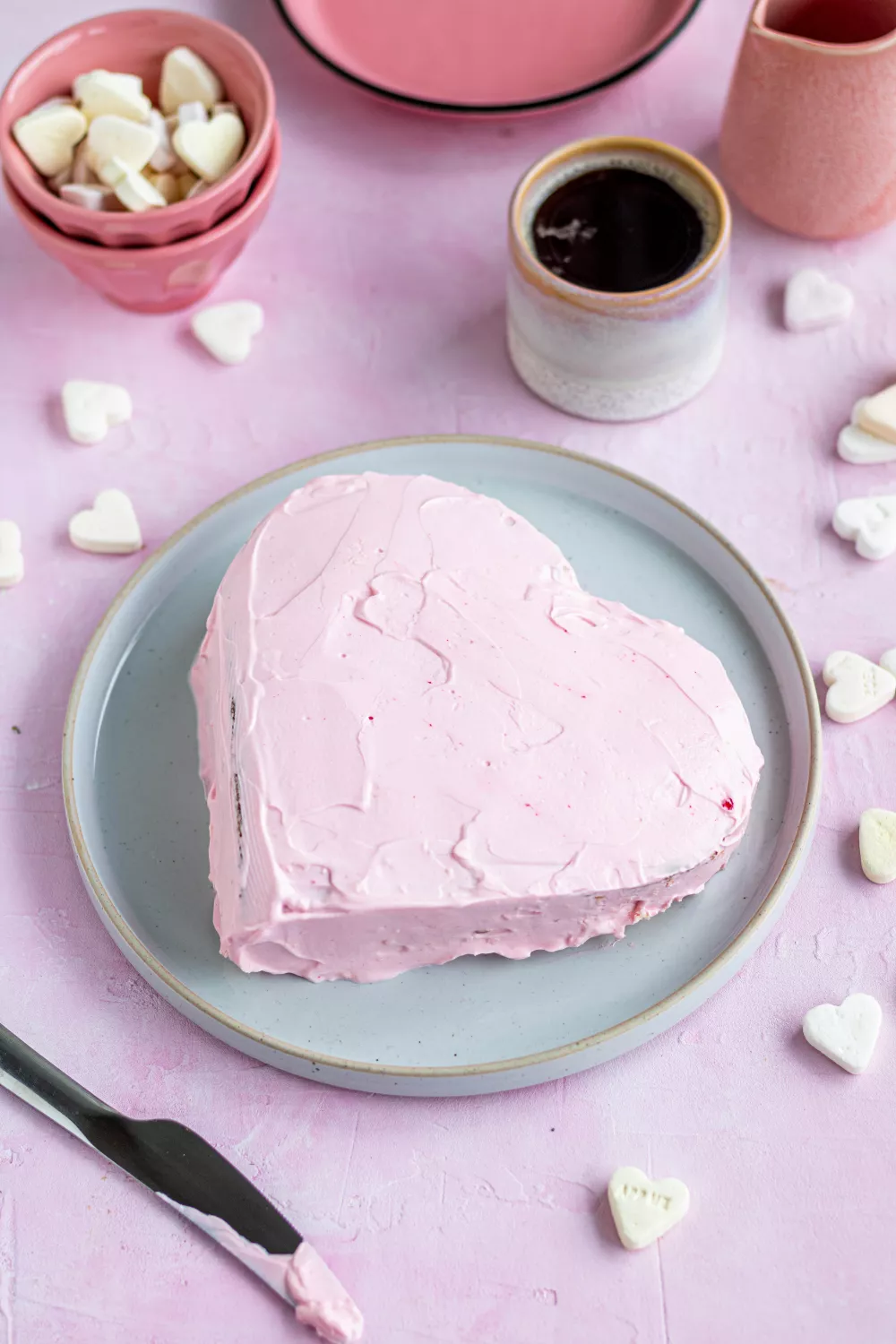 Smeer nu de volledige cake rondomrond in met de frosting tot je cake volledig bedekt is en je een hartje bekomt.
