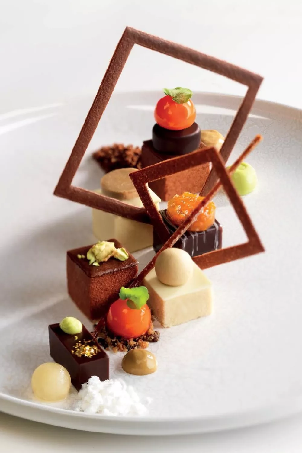 Plaats de blokjes panna cotta en de blokjes van mousse d’épices mooi op een bord. Leg er enkele koekjes van tuillebeslag, stukjes bros van witte chocolade, crumble van gemalen koekjes en pistachenoten bij. Haal de cremeux van passievrucht uit de diepvriezer en haal door de gelei. Plaats bovenop de blokjes. Werk af met compote van abrikozen, mousse van pistache, chocoladekoekjes, de nougatstaafjes en enkele takjes groen.