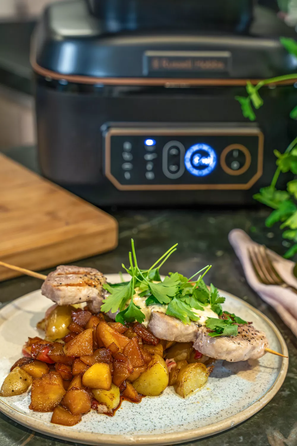 Malse varkensbrochettes met gekarameliseerde appeltjes en goudbruine krielaardappelen vormen een smaakvol hoofdgerecht dat tegelijk rustiek en feestelijk aanvoelt. De brochettes worden kort gegrild in de multicooker, de appeltjes gebakken en geflambeerd met rum en de krieltjes krijgen extra smaak door spek en tijm. Afgewerkt met frisse mayonaise met mosterd en citroen is dit comfort food perfect voor een warme herfstmaaltijd of een gezellige weekendbijeenkomst.