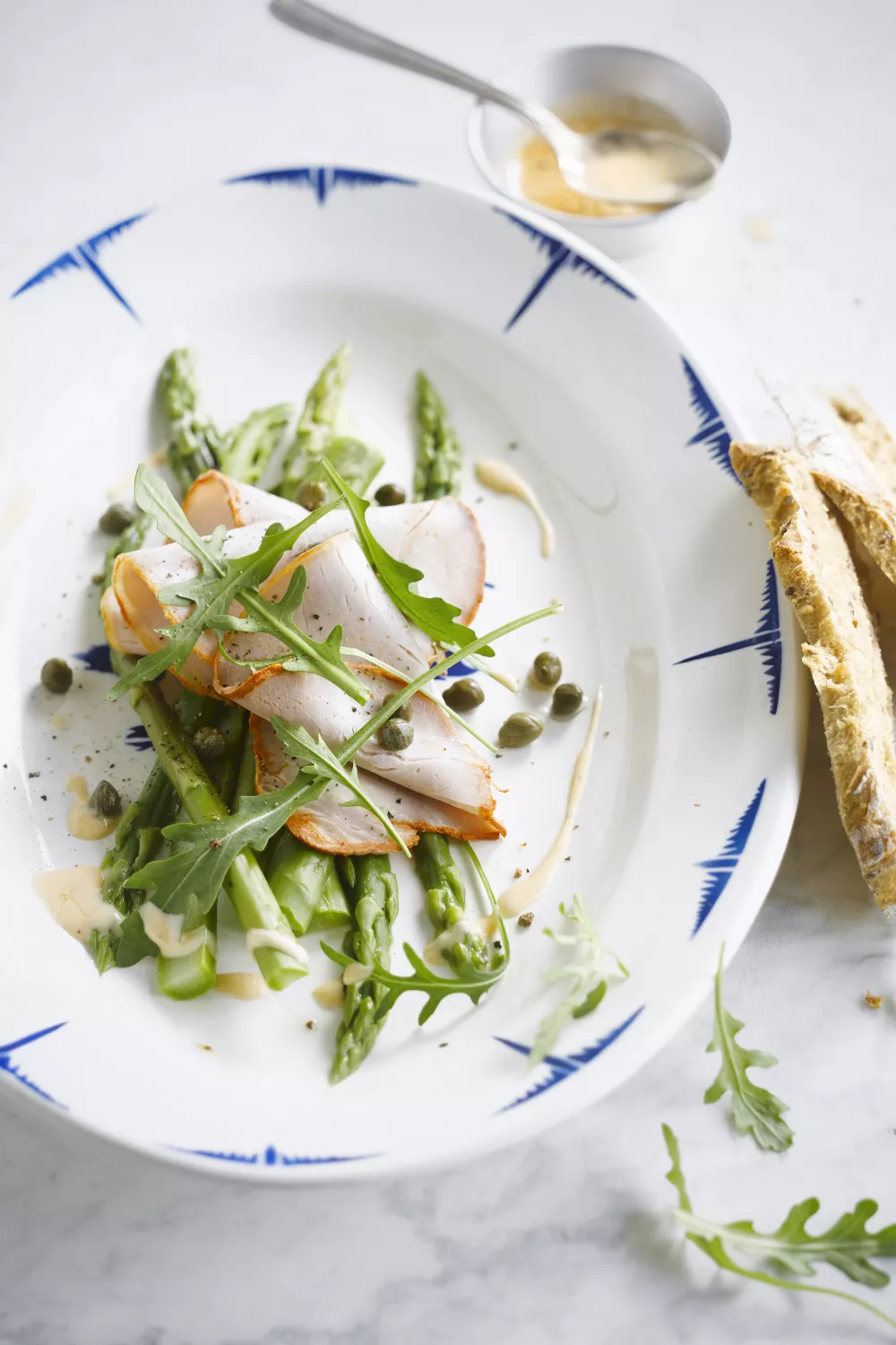 Schik de asperges op een bord en leg er fijne sneetjes varkensgebraad en raketsla op. Strooi er de kappertjes over en enkele druppels van de dressing. Kruid met versgemalen peper en zout.