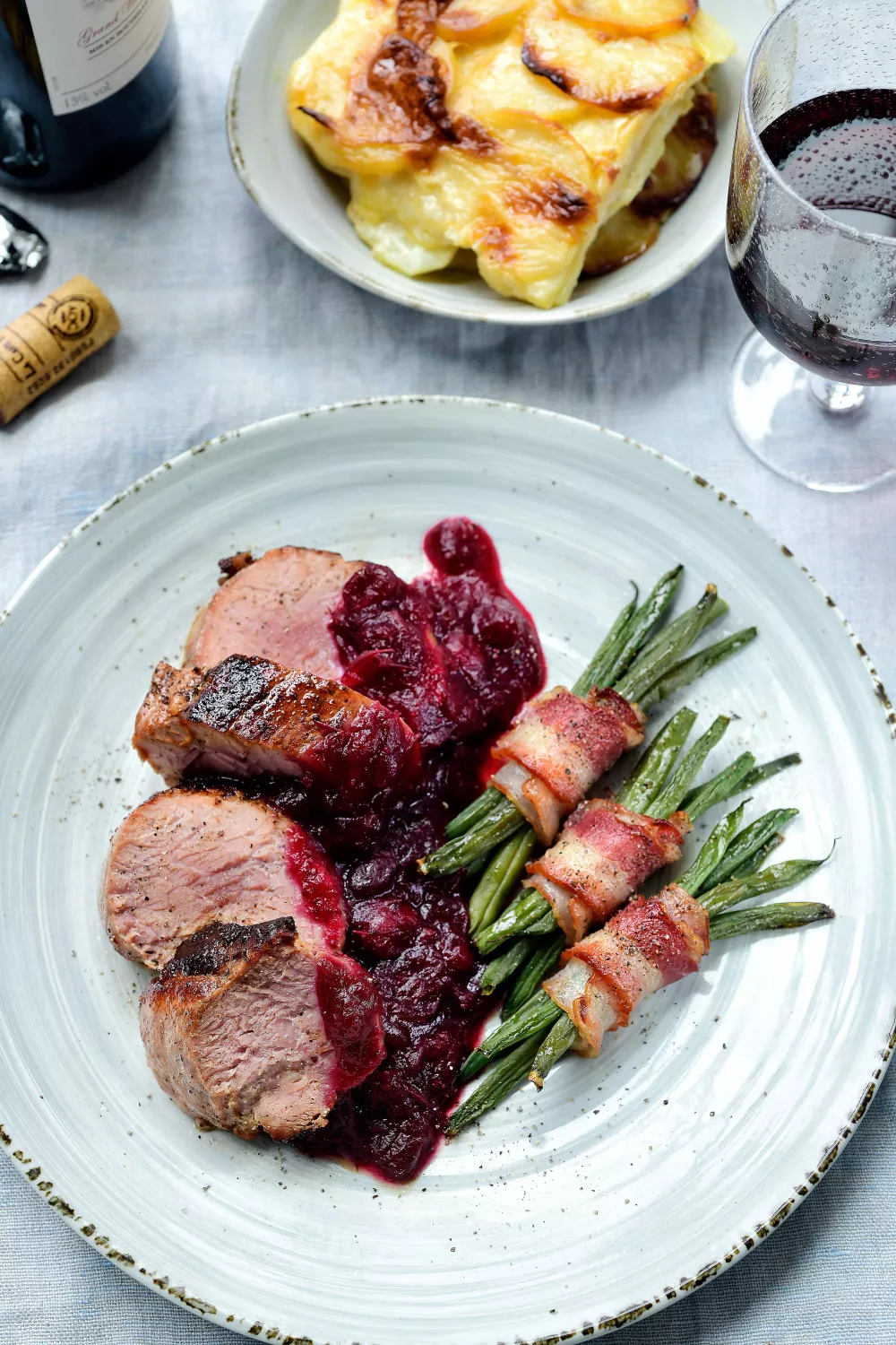 Snijd het varkenshaasje in plakjes en dresseer met de veenbessensaus, de aardappelgratin en de boontjes in spek.