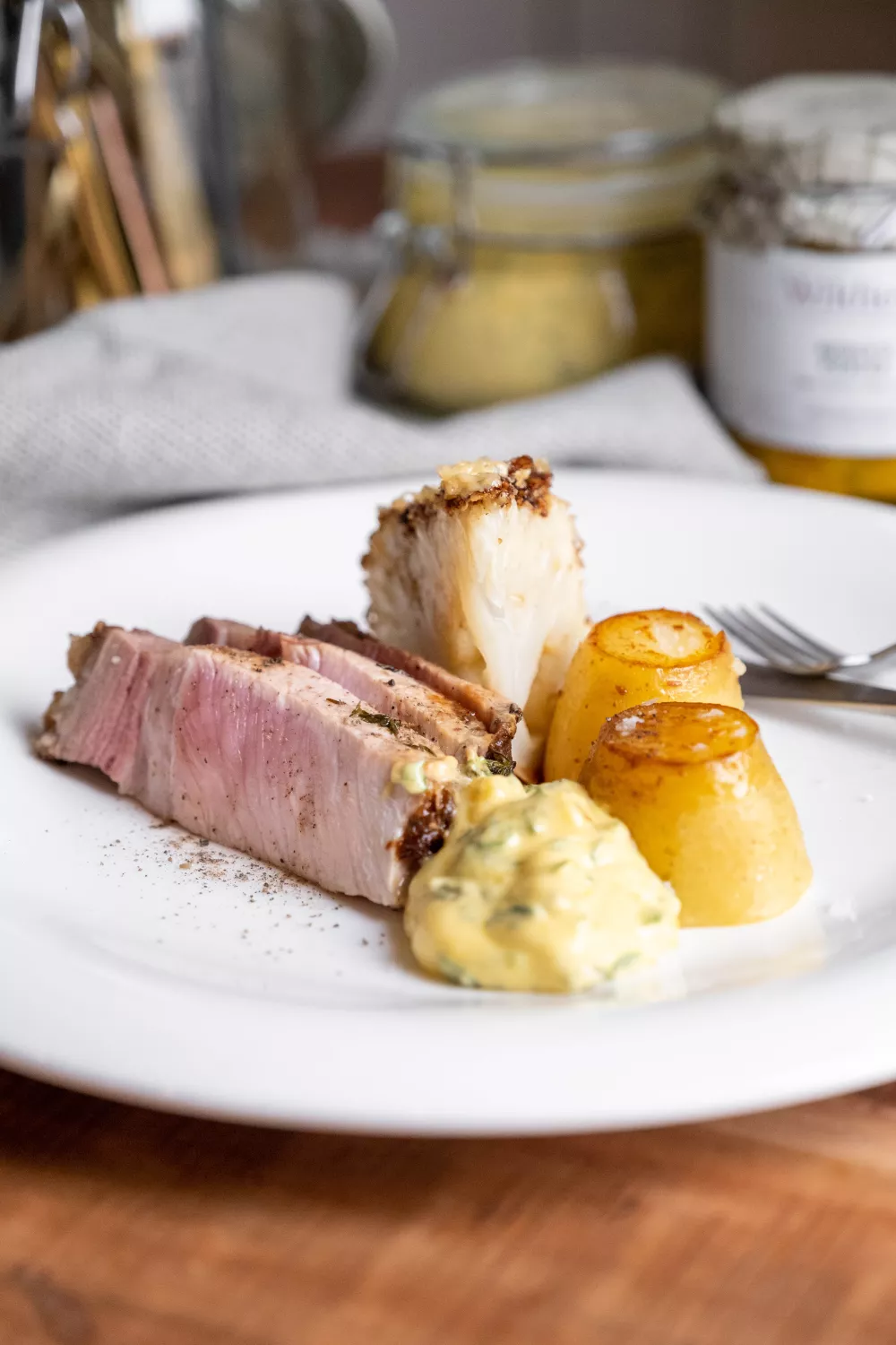 Een feestelijk hoofdgerecht met een goudbruin geroosterde varkenskroon, ovengebakken bloemkool met hazelnoten en Oude Flandrien en krokant gebakken krielaardappelen in smout. De romige mousseline van pickles en fijngehakte dragon geeft het geheel een frisse, pittige toets. Perfect voor een herfstig of winterig diner waarbij roosteren, gratineren en emulgeren samenkomen.