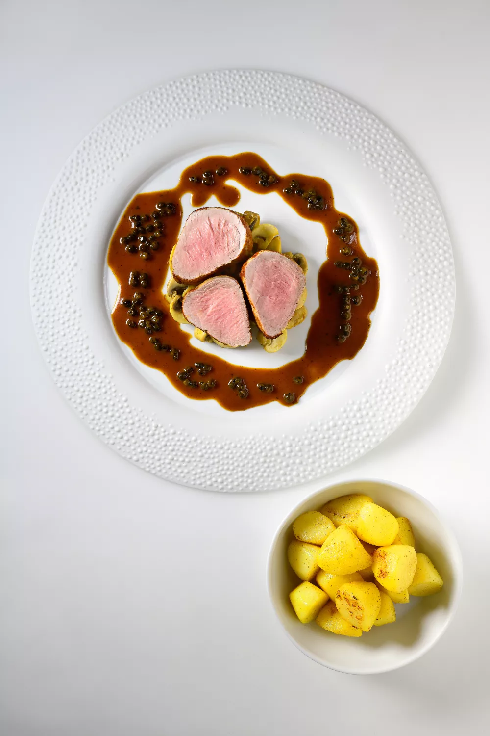 Dresseer de champignons in het midden van de borden. Snijd het varkenshaasje in plakjes en schik die boven op de champignons. Serveer met de peperroomsaus en de gebakken aardappelen.