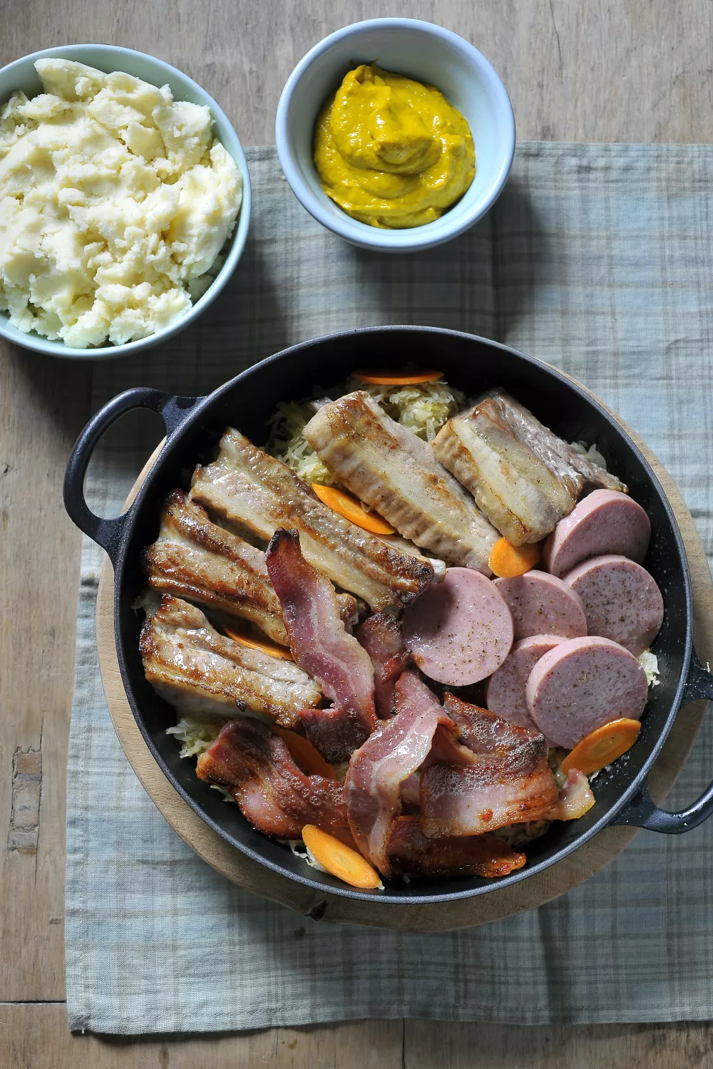 Serveer de zuurkool met de varkensribbetjes, enkele plakjes Parijse worst, enkele plakjes gerookt spek en de puree.