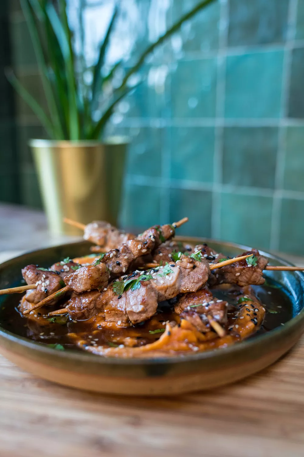 Knapperige varkensspiesjes met een plakkerige saus van gember, porto en sojasaus, geserveerd op een fluweelachtige zoete aardappelcrème met tahini. Pittige chili, frisse koriander en geroosterd sesamzaad geven een oosterse twist die zowel past bij een gezellige barbecue als bij een verwarmend herfstmaal. Snel aanbraden van het varkenshaasje en het kort inkoken van de saus zorgen voor rijke umami en aangename textuur.