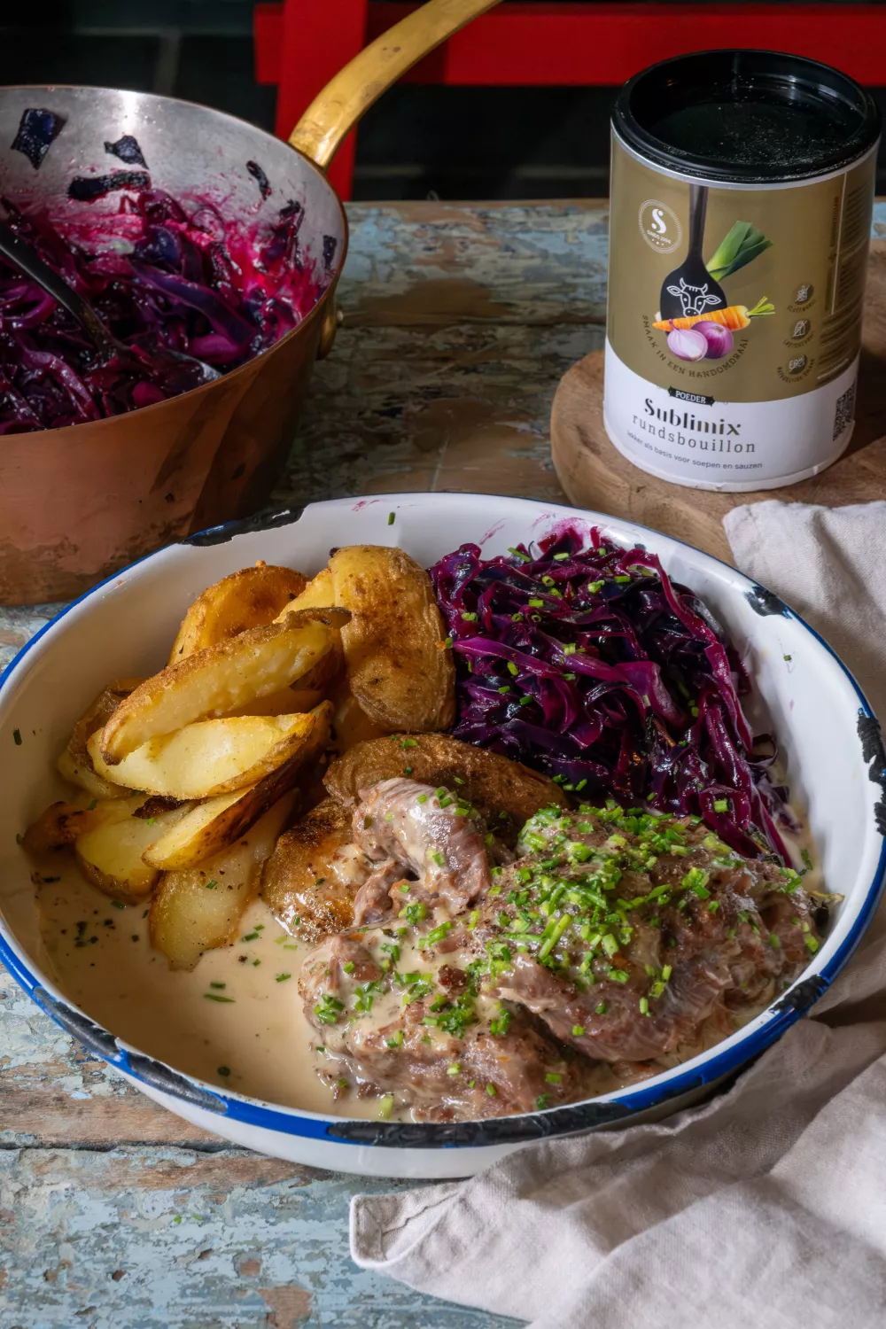 Mals gestoofde varkenswangen in een romige saus van Inex volle room en Sublimix rundsbouillon, geserveerd met zoet-zure rode kool en krokante aardappelen. Een bord vol troost en traditie. Langzaam gegaard, rijk van smaak en perfect in balans. Dit gerecht combineert Vlaamse klassiekers met pure ingrediënten voor een resultaat dat smelt op de tong.
