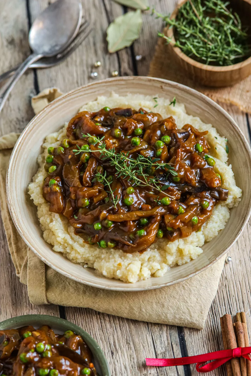 Een hartverwarmende vegan auberginehachee met kastanjechampignons, doperwten en ontbijtkoek, zacht gesmoord in rode wijn, tomatenpuree en sojasaus voor diepe umami smaken. Daartegenover staat een zijdezachte knolselderijpuree met knoflook en een scheut plantaardige melk, verfijnd met rozemarijn en kaneel. Perfect als stevige herfst of wintermaaltijd voor gezellige diners en comfort aan tafel.