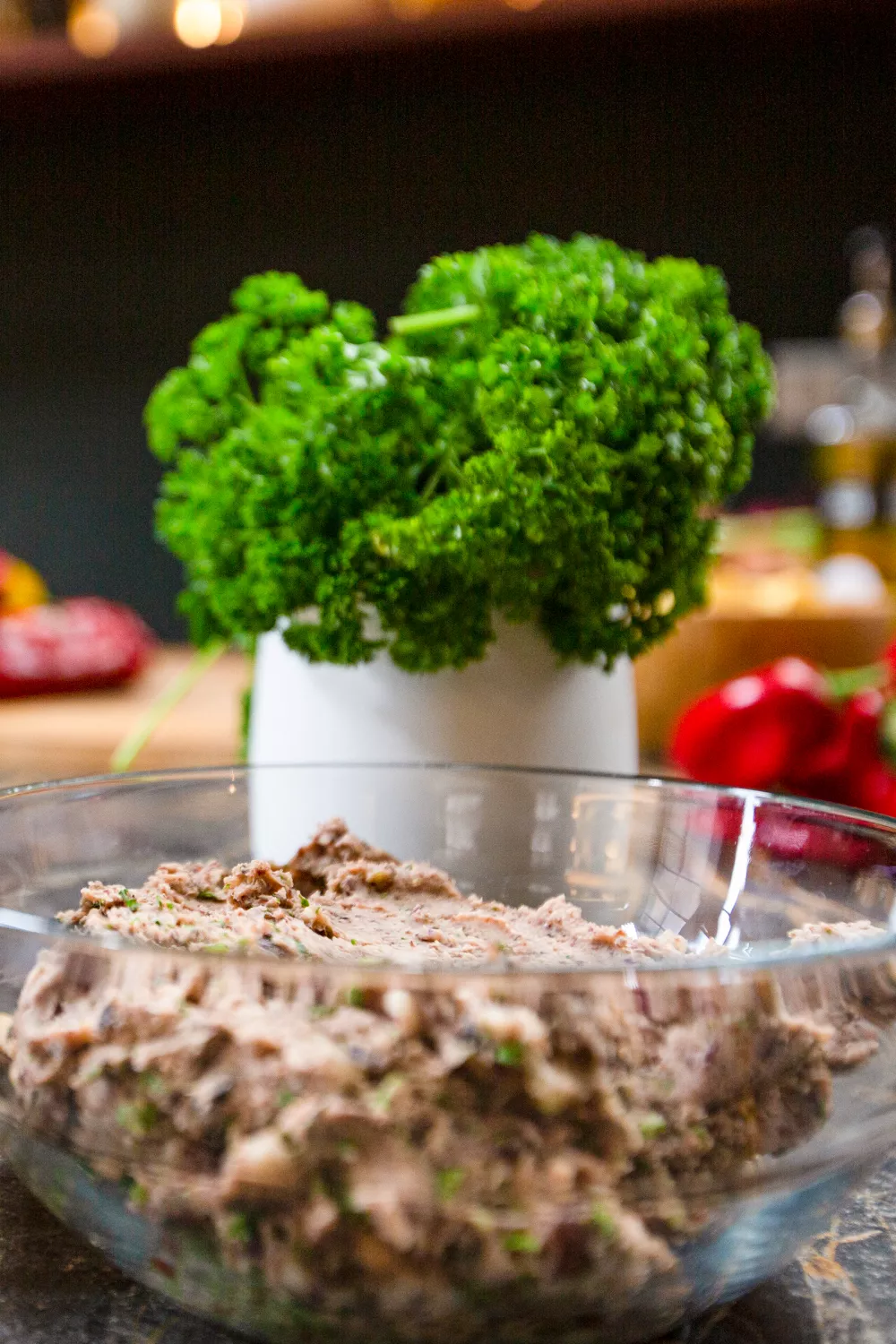 Schep de ovengedroogde bonen bij de gehakte kruiden met sjalot, en voeg het papje van lijnzaad toe. Kruid met wat grof zeezout en versgemalen zwarte peper. Hak de bonen met lijnzaad en kruiden fijn, maar vermijd dat de bonen ‘platgemixt’ zijn. Je wil een beetje structuur of korrel behouden in het vegan gehakt. Roer het mengsel tussendoor even om, zodat het een egaal gehakt wordt.