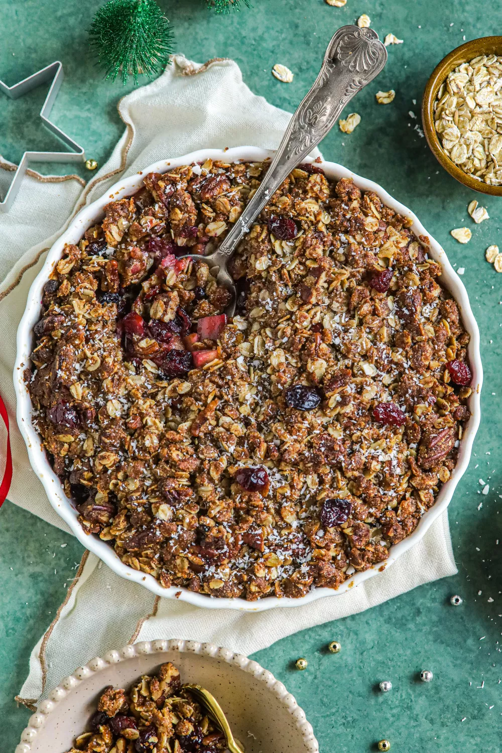 Deze vegan cranberry appel en pruimencrumble combineert frisse sinaasappel, zoete blauwe bessen en verwarmende speculaaskruiden tot een geurige en knapperige traktatie uit de oven. Een voedzame kruimellaag van havervlokken, amandelmeel, pecannoten en gesmolten kokosolie zorgt voor rijke textuur en diepte. Meng het fruit met sinaasappelsap, strooi de crumble erover en bak 25 tot 30 minuten; heerlijk als herfstig dessert of stevig ontbijt.