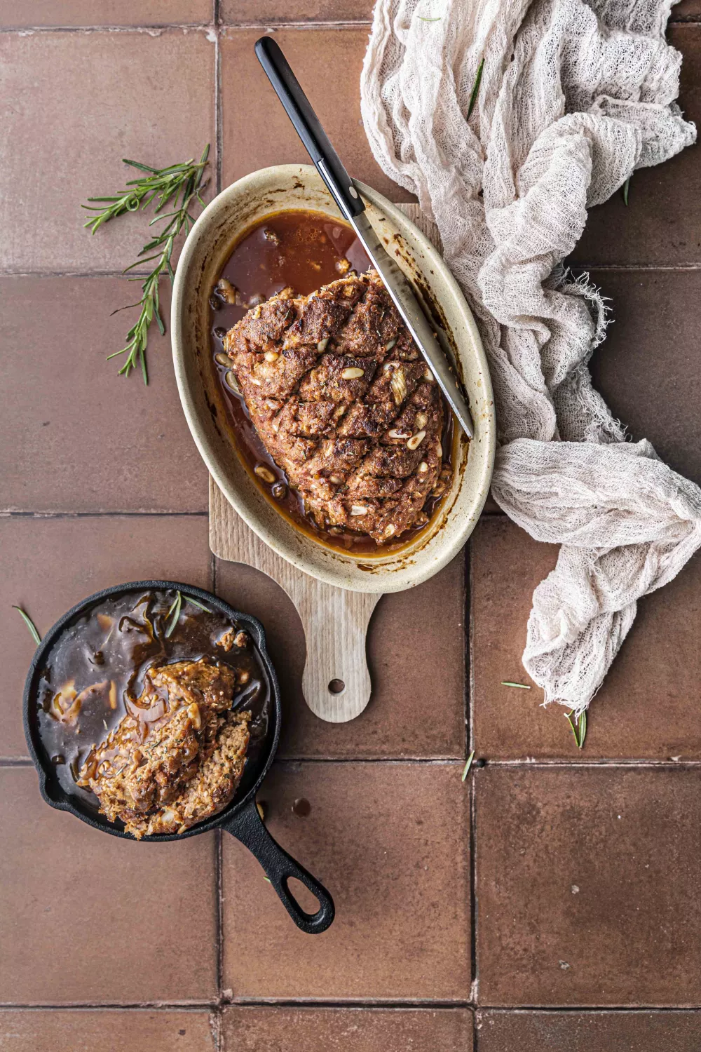 Dit smeuïge vegan gehaktbrood met een rijke vegan bruine saus combineert rozemarijn, gerookte paprika en een snufje kaneel met krokante pijnboompitten voor een volle, kruidige smaak. Het brood wordt goed gekneed en in de oven gebakken terwijl de saus langzaam indikt op basis van sojasaus en een scheutje rode wijn of water. Heerlijk bij een gezellig familiediner in de herfst en winter, geserveerd met geroosterde groenten of romige aardappelpuree.