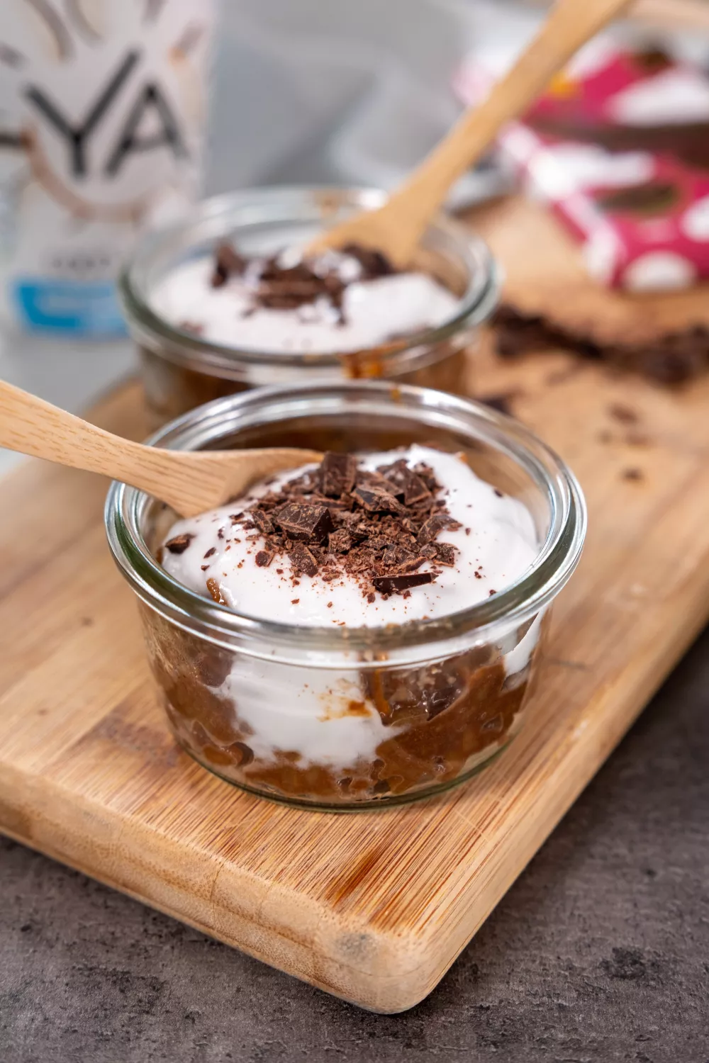 Rasp een beetje sinaasappelschil en voeg dit nog toe aan de rijstpudding. Haal de pan van het vuur en verdeel de rijstpudding over verschillende glaasjes. Werk af met een lepel kokosyoghurt en wat pure chocolade.
