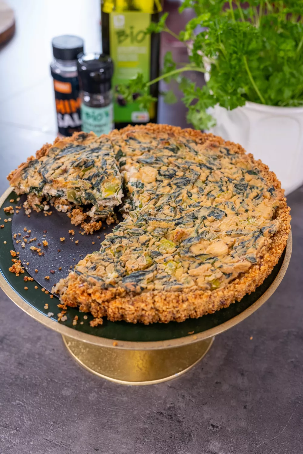 Deze vegan spinazie quiche met een krokante quinoa bodem is een hartige, lichte keuze voor lunch of brunch. Zachte tofu, gebakken prei en verse spinazie smelten samen met edelgistvlokken en gebroken lijnzaad als bindmiddel voor een romige, umamirijke vulling. Een makkelijk ovengerecht om te bakken en te delen, ideaal voor voorjaarslunches of een ontspannen weekendmaaltijd.
