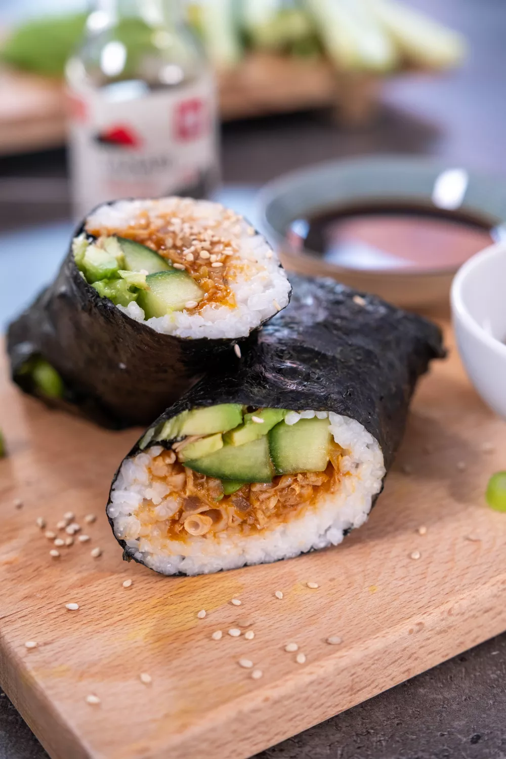 Vegan sushi wraps combineren kleverige sushirijst met hartige jackfruit in bbqsaus, romige avocado en frisse komkommer voor een lichte en smaakvolle lunch of borrelhap. De bereiding is eenvoudig: rijst koken en afkoelen, jackfruit bakken met ui en bbqsaus, daarna vullen en strak rollen in norivellen met een sushimatje. Bestrooi met sesamzaadjes en serveer met sojasaus voor een frisse, Aziatisch geïnspireerde bite ideaal voor lente en zomer.