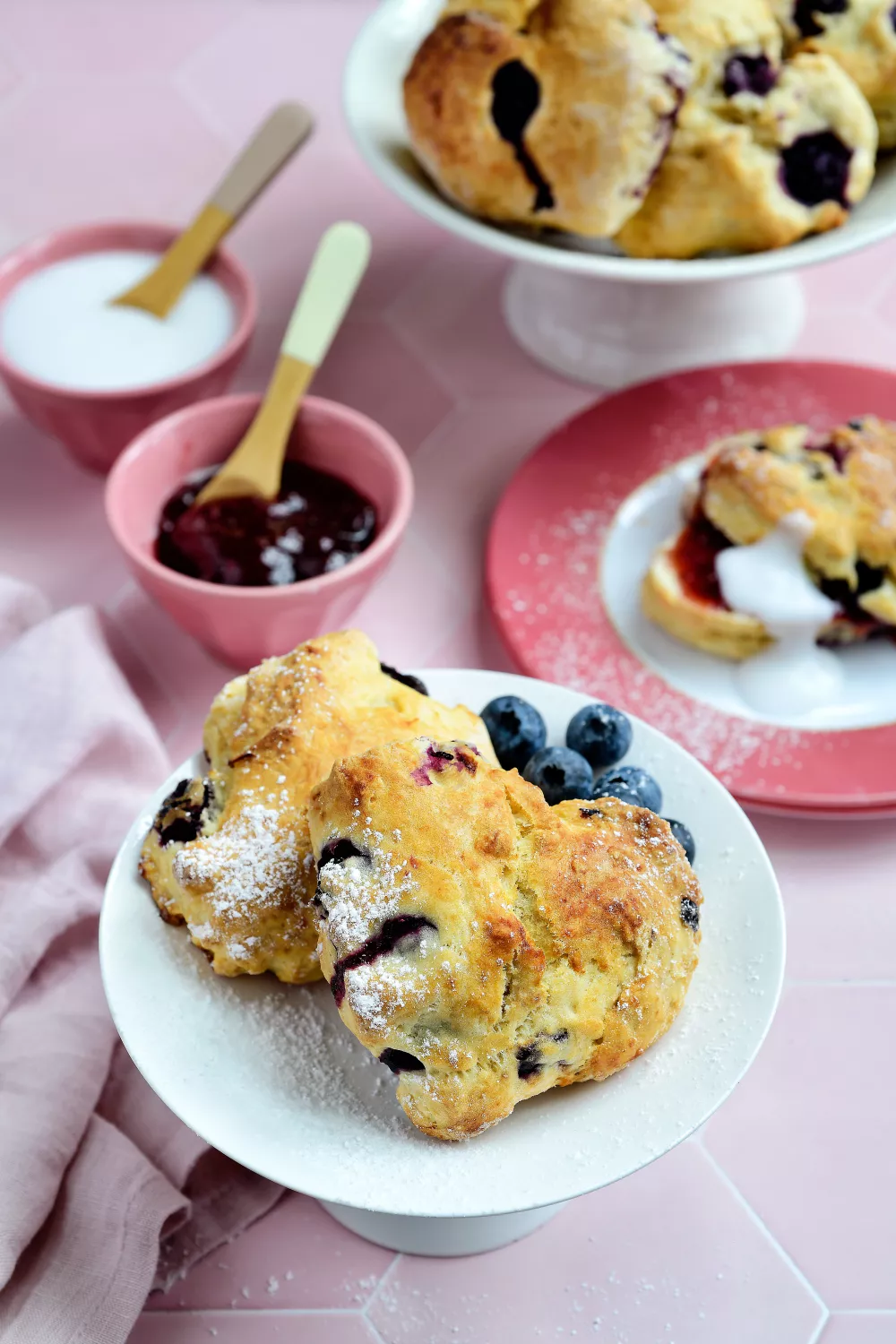 Zachte vegan scones met frisse blauwe bessen en romige kokoscroom vormen een liefelijk ontbijt voor Valentijn. Koude plantaardige boter fijn wrijven door de bloem, het deeg uitrollen en hartjes uitsteken zorgen voor die ambachtelijke, knapperige randjes na bakken in de oven. Werk af met rode vruchtenconfituur en een royale lepel kokosroom voor een feestelijke brunch.