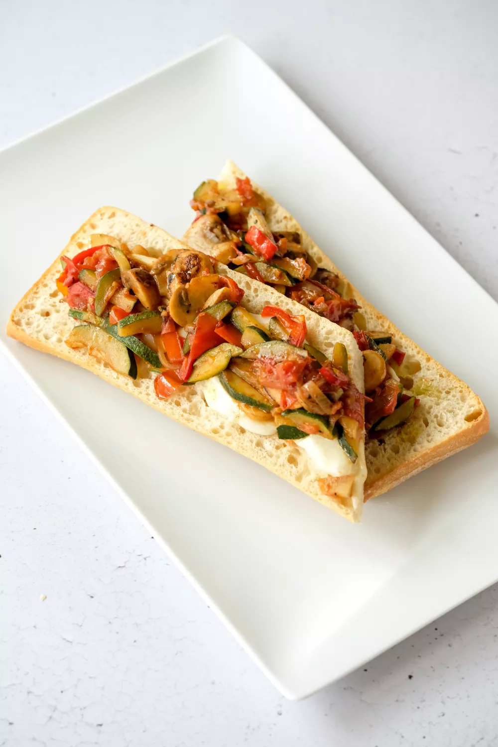 Deze vegetarische pizzabaguette combineert gesmolten mozzarella met gestoofde champignons, tomaat, puntpaprika en courgette voor een smaakvolle, hartige lunch of borrelhap. De groenten worden zachtjes in olijfolie en knoflook gestoofd en de baguettes krijgen een knapperig korstje onder de grill. Perfect als snelle doordeweekse maaltijd of zomers gerecht om te delen tijdens een gezellige avond.