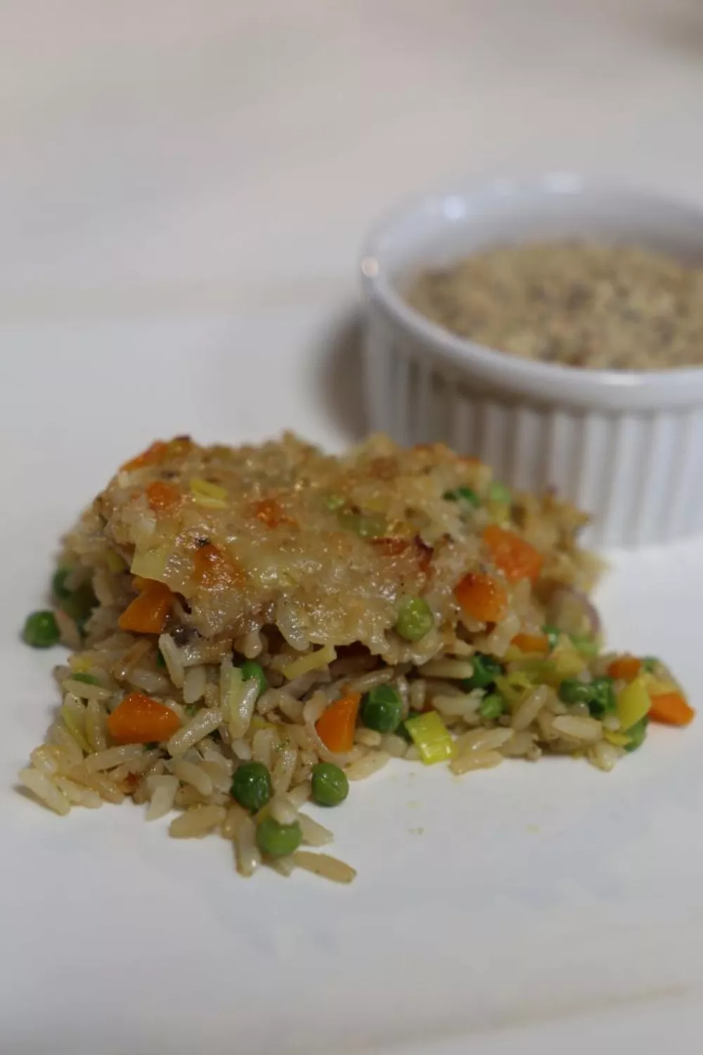 Een kleurrijke vegetarische rijstschotel met romige kikkererwtenspread, boordevol prei, wortel, erwtjes en geraspte kaas, perfect als hartig ovengerecht voor een doordeweekse maaltijd of gezellig etentje. Geroosterde mosterd- en sesamzaadjes met amandel, limoen en yoghurt geven de spread een frisse, nootachtige toets. Makkelijk thuis te maken door zacht stoven, even onder de grill voor een krokant kaaskorstje en de spread kort te pureren in de blender.