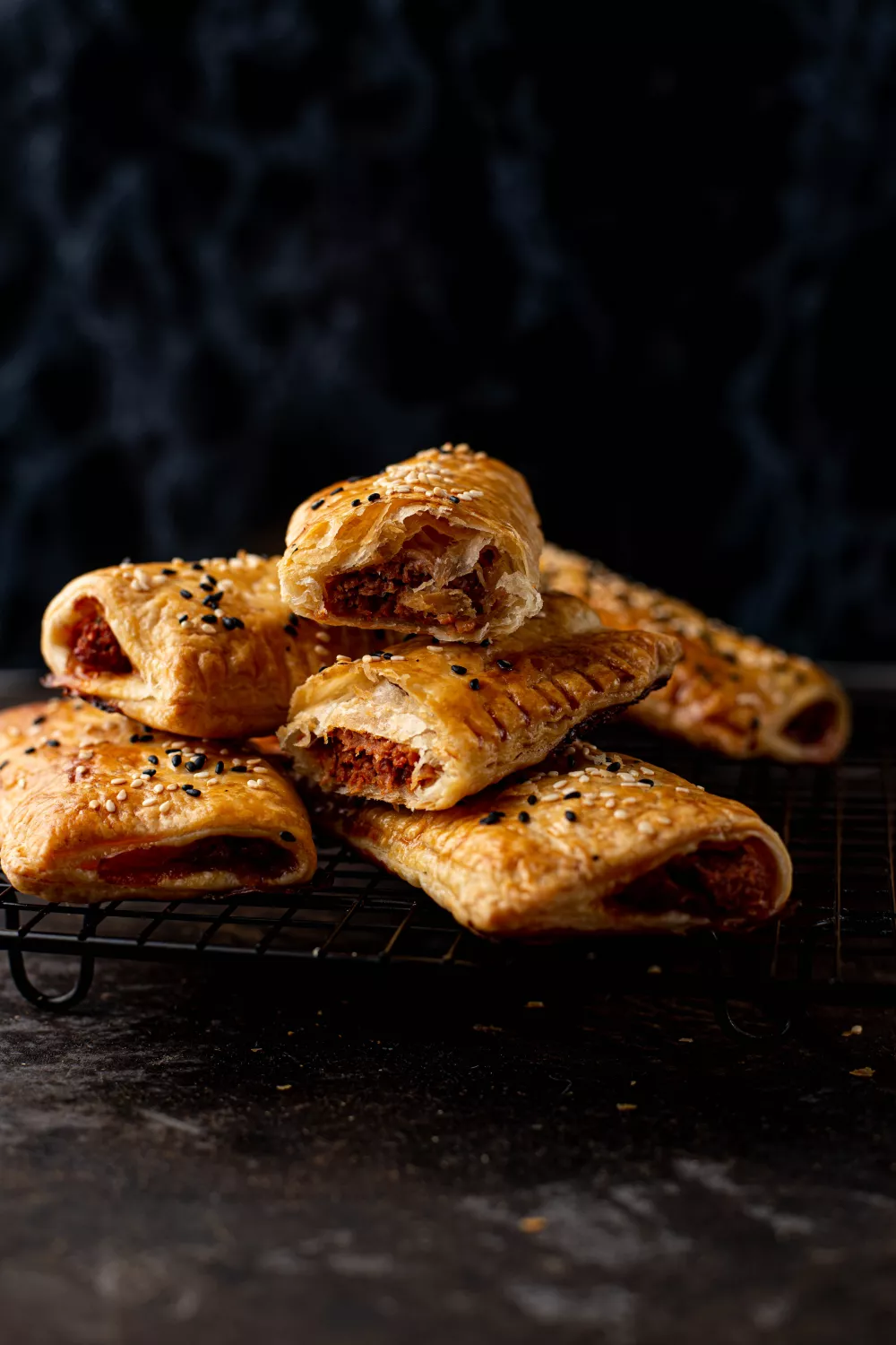 Deze ovengebakken vegetarische saucijzenbroodjes combineren krokant bladerdeeg met pittig gekruid vegetarisch gehakt voor een heerlijk hartig hapje. Tomatenpuree, sambal, rode ui, knoflook en verse peterselie geven de vulling diepgang en bovenop zorgen sesamzaadjes voor een nootachtige crunch. Makkelijk te maken voor borrel, lunch of picknick: vouw de gevulde rolletjes dicht, bestrijk met ei en bak tot ze goudbruin, ideaal voor herfst en winter.