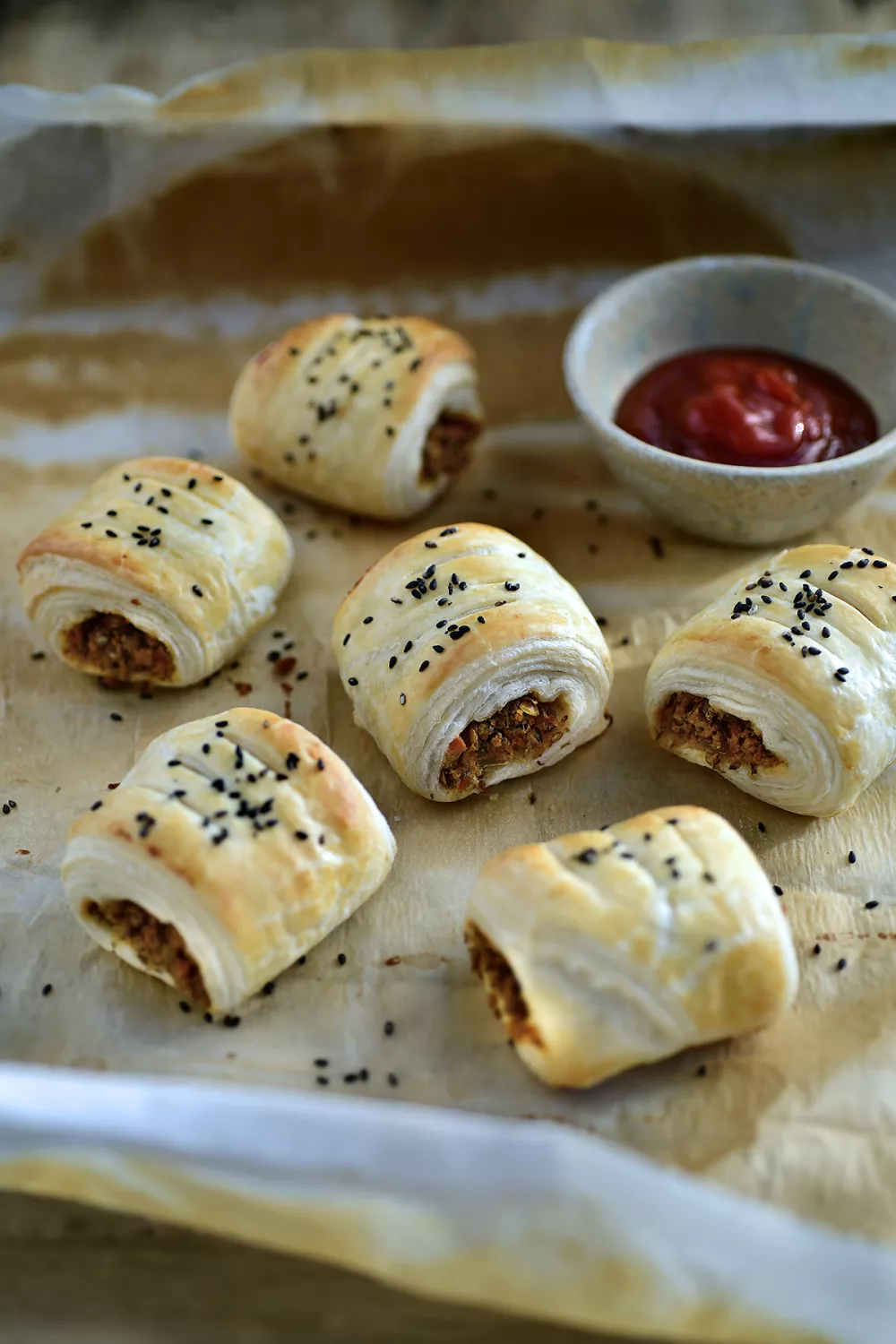 Knapperige vegetarische worstenbroodjes met een hart van linzen, wortel en harissa, omhuld door goudbruin bladerdeeg en licht glanzend van het eimengsel. De vulling wordt zacht gestoofd en grof gestampt voor een rustieke textuur en een warme, licht pittige smaak. Perfect als borrelhap, lunch of herfstige snack en snel klaar dankzij kant en klaar bladerdeeg en een korte oventijd.