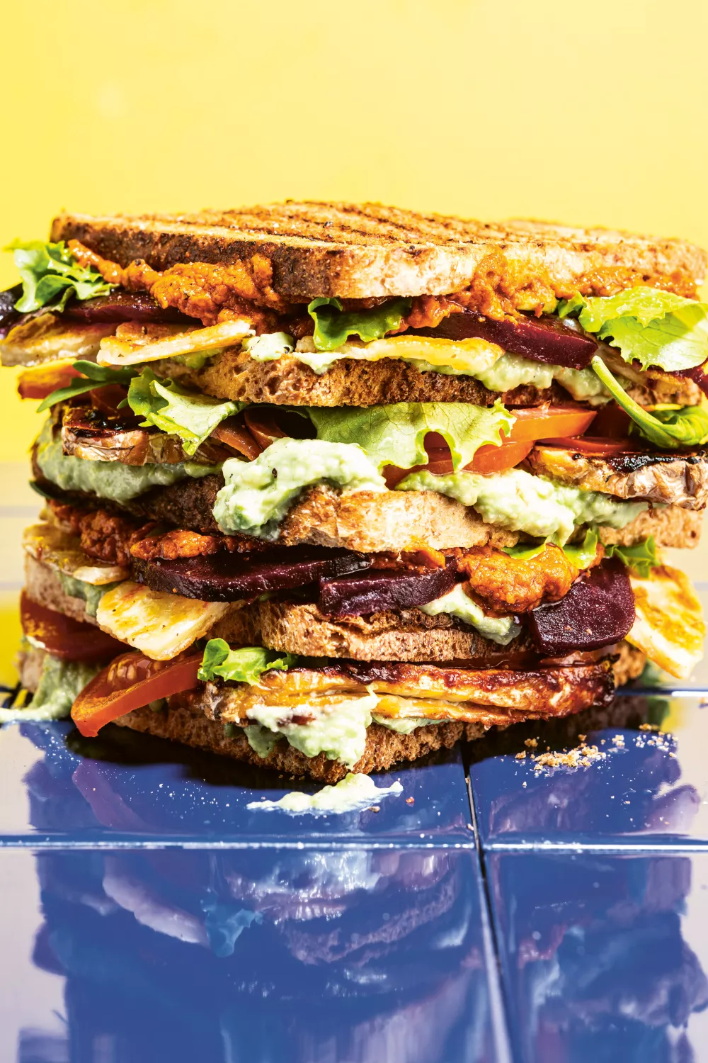Veggie club sandwich met gerookte tempeh, goudbruine berloumi of halloumi, romige guacamole en pittige paprikatapenade. De combinatie van in de oven gebakken tempeh en in de pan gebakken halloumi, afgewisseld met verse tomaat, rode biet en knapperig toastbrood levert een stevige, smaakvolle lunch of borrelhap. Eenvoudig op te bouwen laagjes en korte bak en toasttijd maken dit ideaal voor zomerse picknicks of doordeweekse maaltijden.