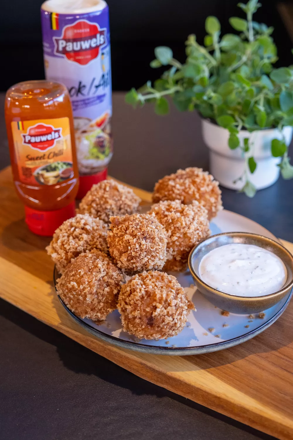 Frituur de balletjes goudbruin in de friteuse op 180 graden gedurende 4 à 5 minuten. Laat ze uitlekken op keukenpapier en serveer ze samen met de dipsaus.