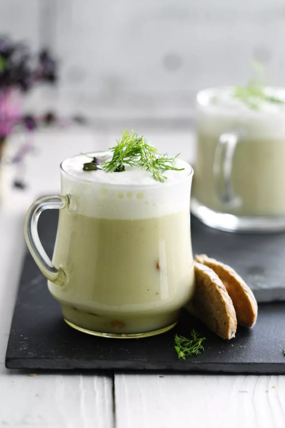 Warm de room op met de melk en een beetje venkelgroen. Kruid met peper en zout en mix tot een schuimig geheel.