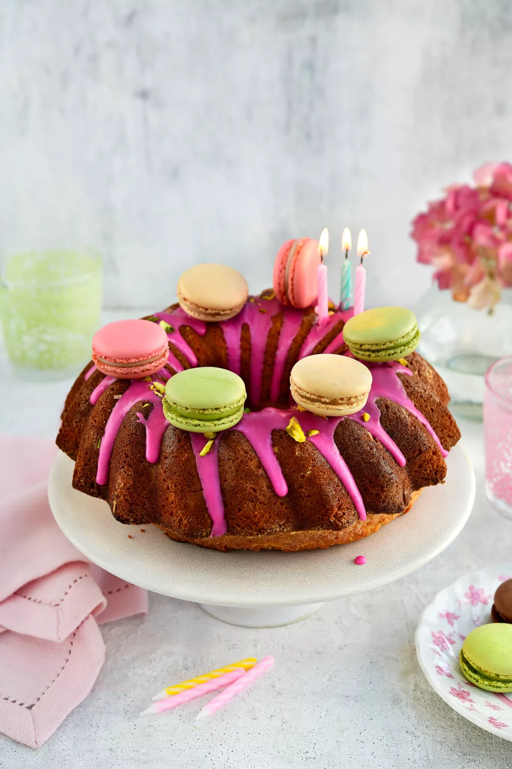 Deze verjaardagscake is een echte klassieker die altijd in de smaak valt. Een zachte, luchtige cake vormt de perfecte basis voor een feestelijke topping van roze glazuur, afgewerkt met macarons en vrolijke kaarsjes. Dit eenvoudige recept is ideaal voor verjaardagen en andere feestmomenten, en kan makkelijk aangepast worden naar jouw eigen stijl of kleurenthema. Perfect om zelf te bakken én te versieren.