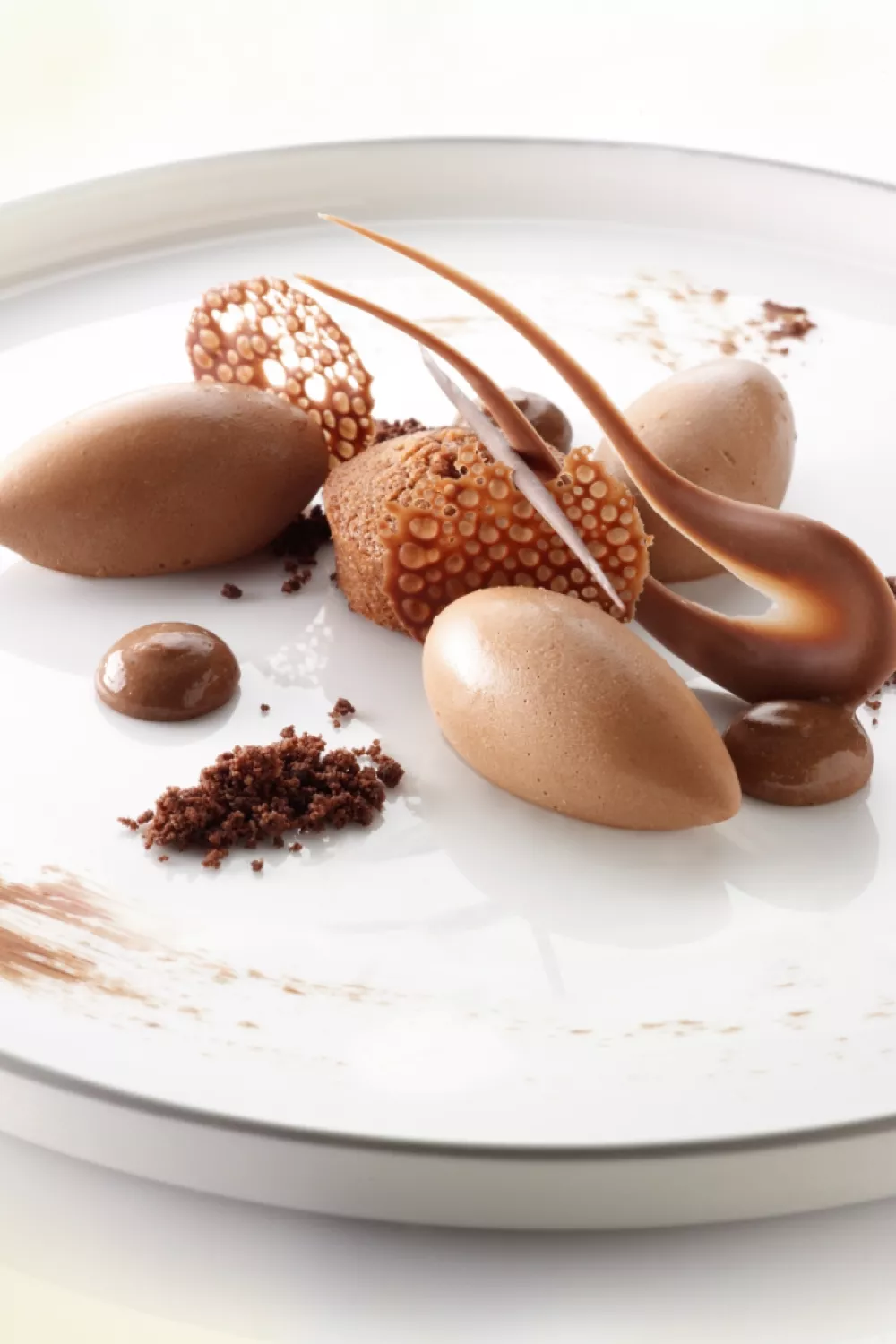 Vijf verschillende dessertjes met chocolade combineren romige ganache en luchtige mousse met knapperig krokant en een aromatische amandelcrumble tot een feestelijk nagerecht. Met technieken als sabayon, smelten van chocolade, opkloppen van room en bakken zet je professionele patisserie op tafel. Perfect voor een diner met gasten of een winterse traktatie waarbij verschillende texturen en pure chocolade schitteren.