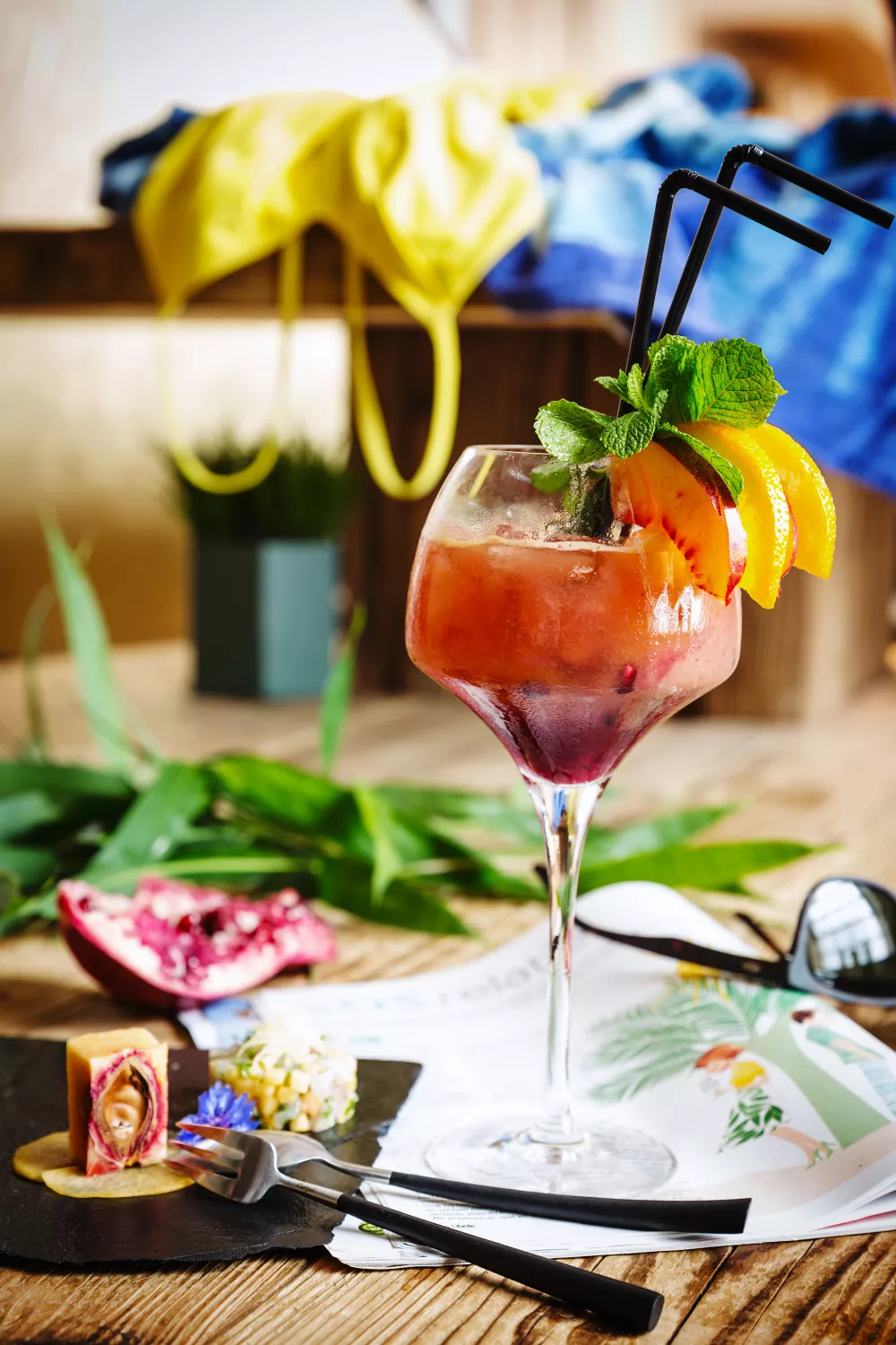 Zomer op het bord en in het glas: Virgin on the Beach brengt perzikcoulis, granaatappel en sinaasappel samen in een gelaagde alcoholvrije cocktail, terwijl een tartaar van kabeljauw met salie en ingelegde gember het ziltige tegenwicht vormt. De bereiding werkt met pekelen, een huisgemaakte gembersiroop en fijngehakte perzik voor een frisse, fruitige textuur. Perfect als aperitief of lichte lunch, gepresenteerd in hoge glazen en nette ringetjes.