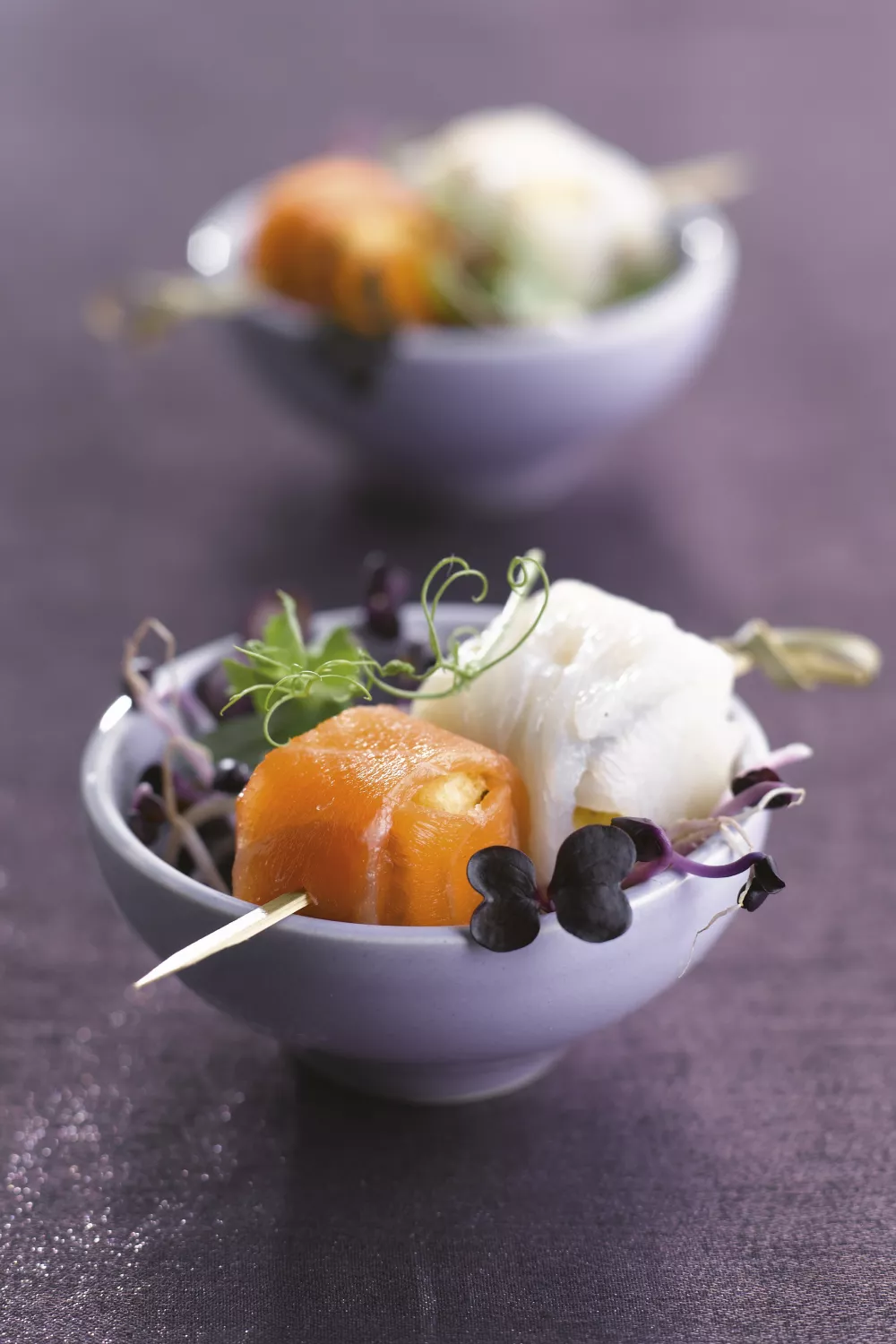 Prik de visblokjes op een stokje en serveer er scheuten bij.