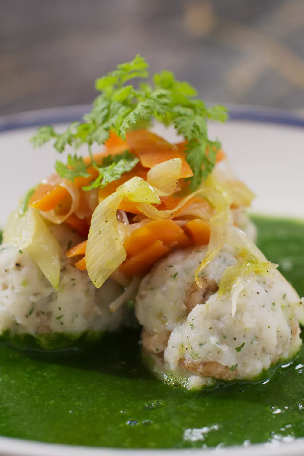 Lichte visballetjes in een frisgroene kruidencoulis met grijze garnalen en een vleugje citroen: verfijnd genoeg voor een etentje en toch huiselijk voor elke doordeweekse maaltijd. De balletjes worden zachtjes in bouillon gepocheerd terwijl wortel en prei gestoofd worden voor textuur en diepte. Met ingekookt pocheervocht, aardappel, verse spinazie en kruiden mix je tot een fluweelzachte, lenteachtige saus.