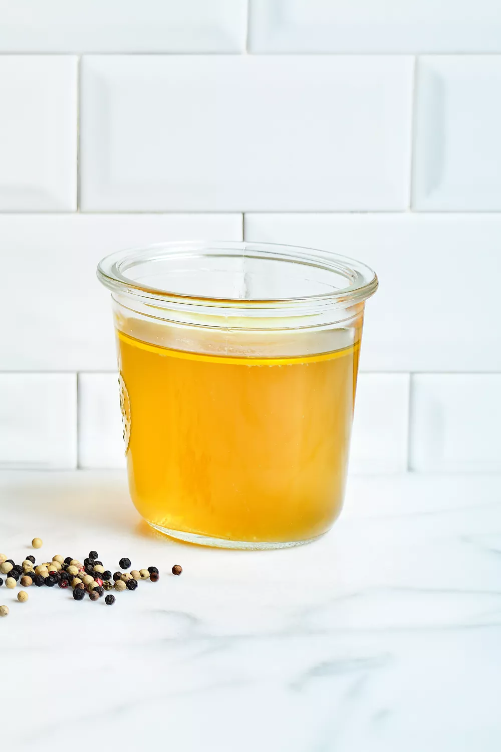 Schil de citroen en snijd hem in plakjes. Doe hem ook bij in de pot. Voeg voor extra smaak de laurier, de tijm en de peperbolletjes toe.