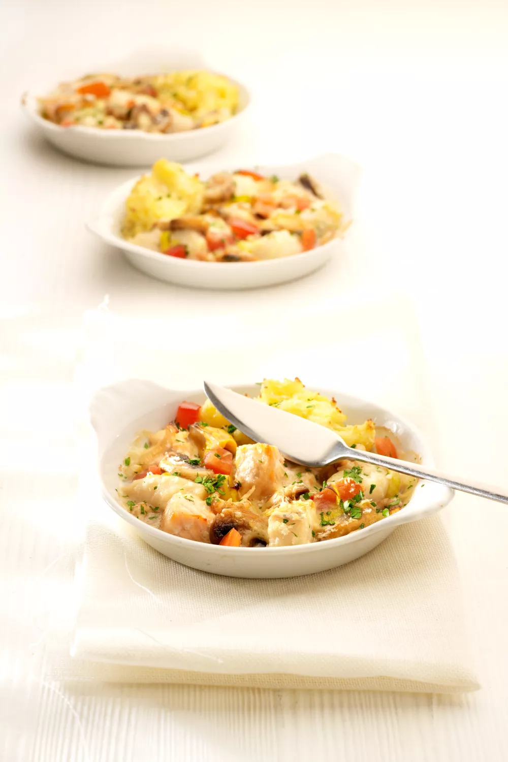 Een romig vispannetje boordevol zeevruchten en zachte witvis, afgewerkt met een goudbruine gratin van gruyère en paneermeel. Met Sint Jakobsvruchten, grijze garnalen, mosselen, zalm en kabeljauw en een saus van witte wijn en room is dit een feestelijke ovenschotel voor koude avonden of een familiediner. Aardappelpuree omlijst de vulling, de vis wordt kort gestoofd en vervolgens gegratineerd in de oven voor een knapperige bovenlaag.