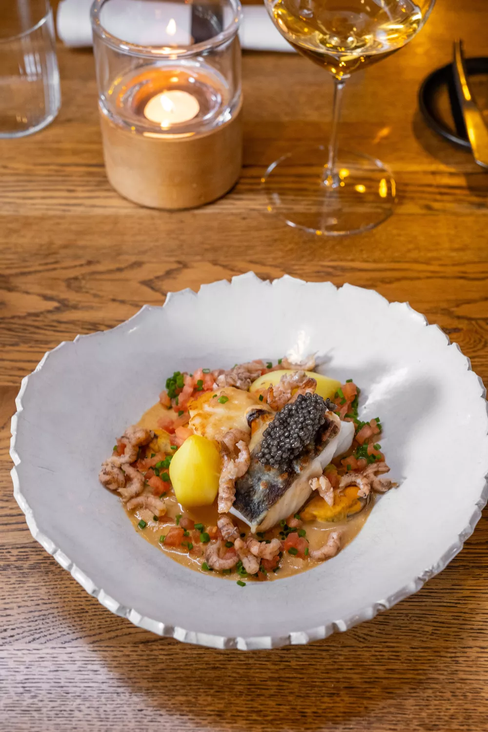 Schep de groenten en de aardappelen in een vuurvaste schaaltjes en schik er de kabeljauw en coquilles bovenop. Strooi er de mosselen en garnalen over. Schenk er de saus over en bestrooi met gemalen kaas. Plaats de vispannetjes gedurende 6 à 7 minuten in een voorverwarmde oven van 180 graden. Werk de vispannetjes af met fijngehakte bieslook, brunoise van tomaat en een lepeltje kaviaar.