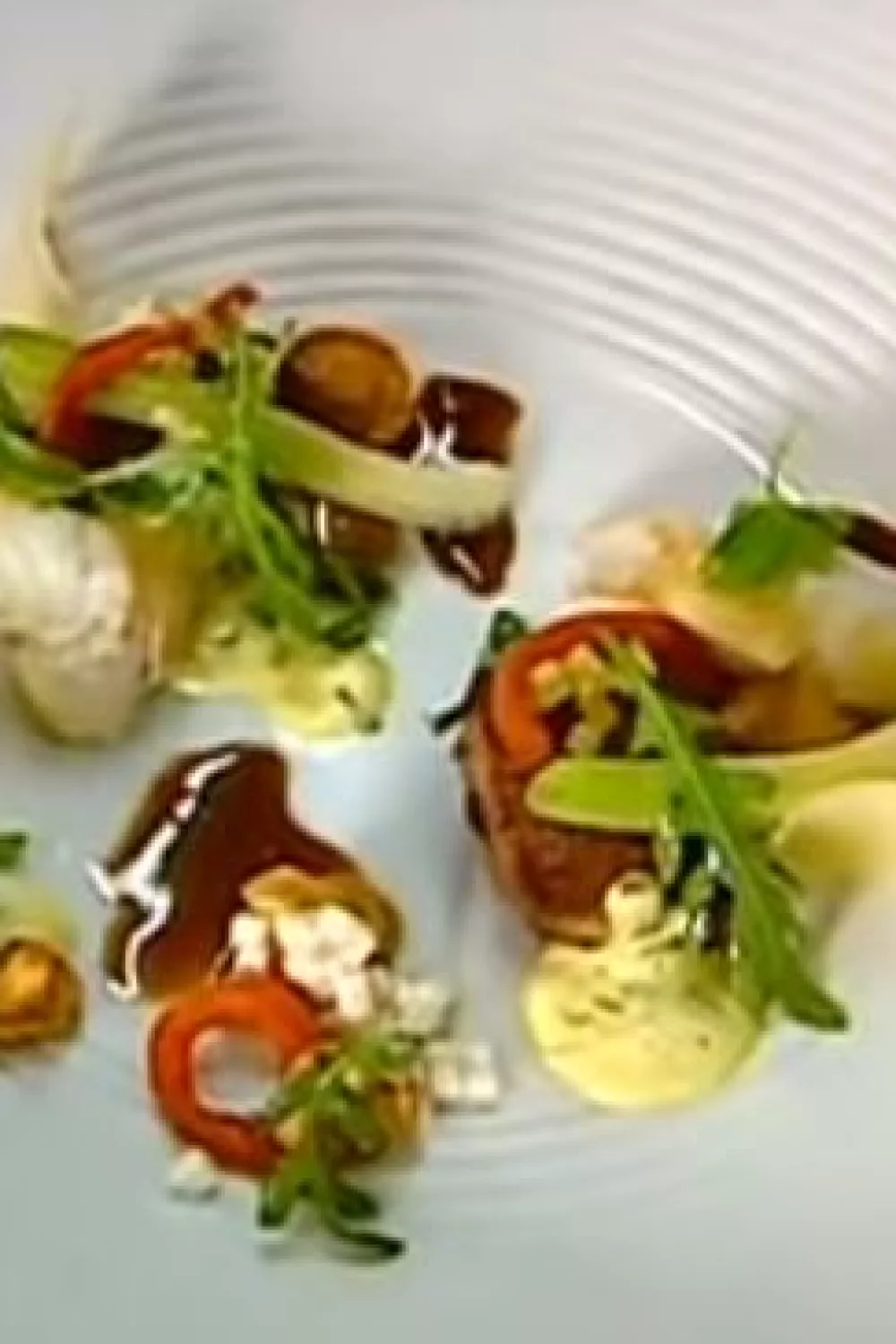 Schik de varkenswangetjes op een warm bord, samen met de lente-uitjes, dooierzwam en de ‘escabèche’ van parijse champignons. Werk verder af met de rucola, tomaatjes, gekonfijte citroen, de gebakken langoustine, Parmezaanse kaas schilfers, basilicumcress en de bearnaise saus.