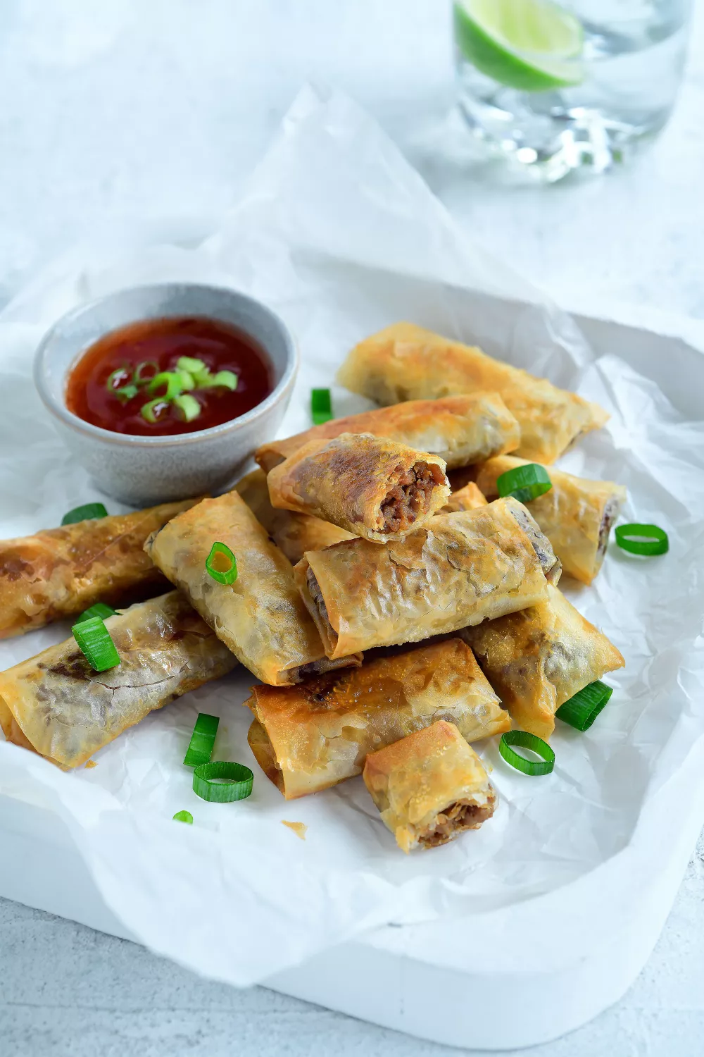 Knapperige vlammetjes van filodeeg gevuld met pittig gehakt, knoflook, rode chili, ketjap en sambal brengen Aziatische smaken naar je borrel of feestje. Het gehakt wordt snel aangemaakt met ui en gemalen koriander, vervolgens gerold in flinterdun filodeeg en goudbruin gefrituurd voor een warme, krokante bite. Perfect als snack bij een avond met vrienden, op een feestelijk buffet of tijdens een gezellige winterse borrel.