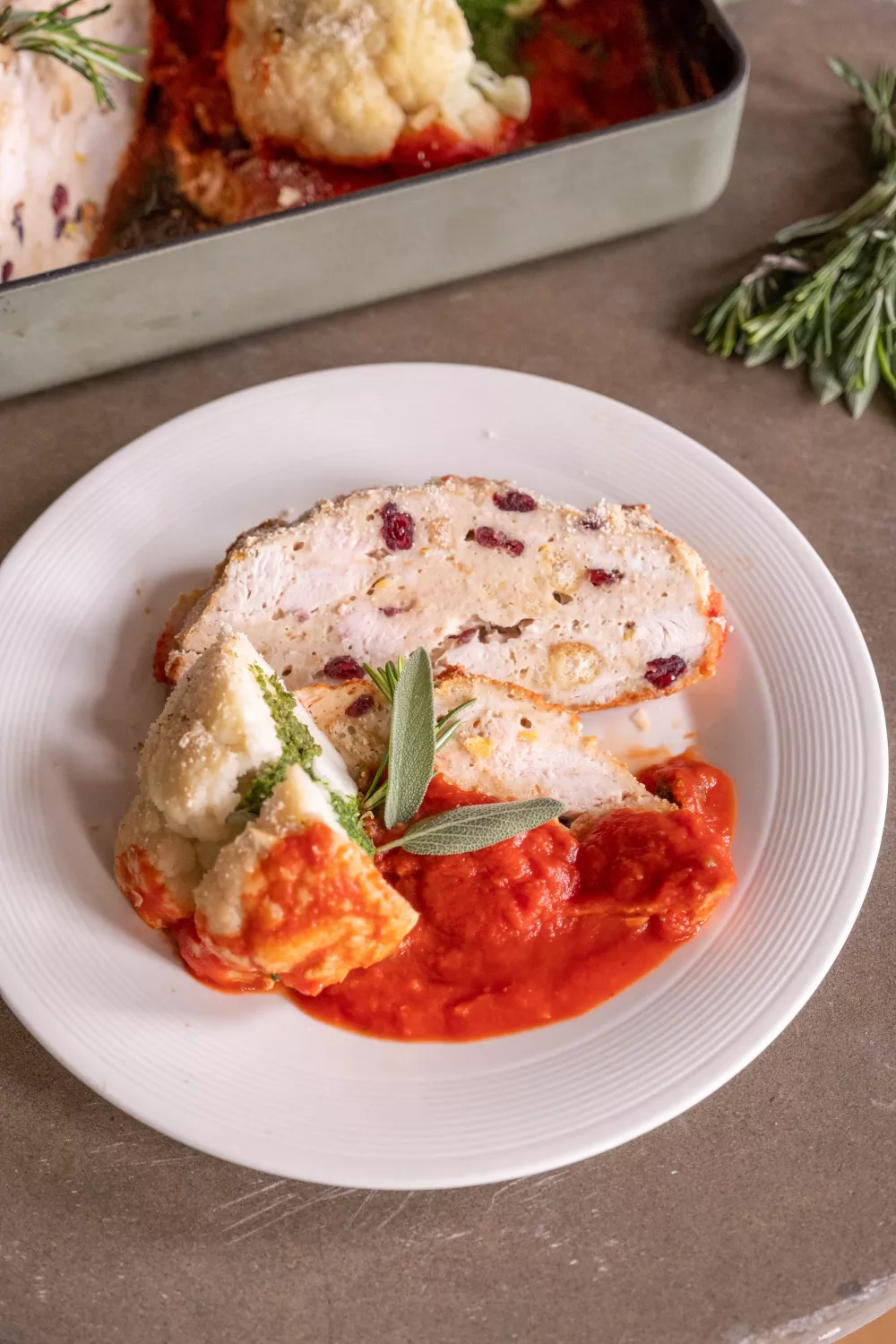 Een hartig vleesbrood van kip en kalkoen, geserveerd met een gevulde bloemkool boordevol boerenkool, sjalot en knapperige pistachenoten. Het gerecht wordt langzaam in de oven gebakken met rijke passata en aromatische salie en rozemarijn, ideaal voor een stevige wintermaaltijd of een feestelijk familiediner. Veenbessen en citroen geven frisse accenten terwijl beschuit en paneermeel zorgen voor een smeuïge binding en een goudbruin korstje.