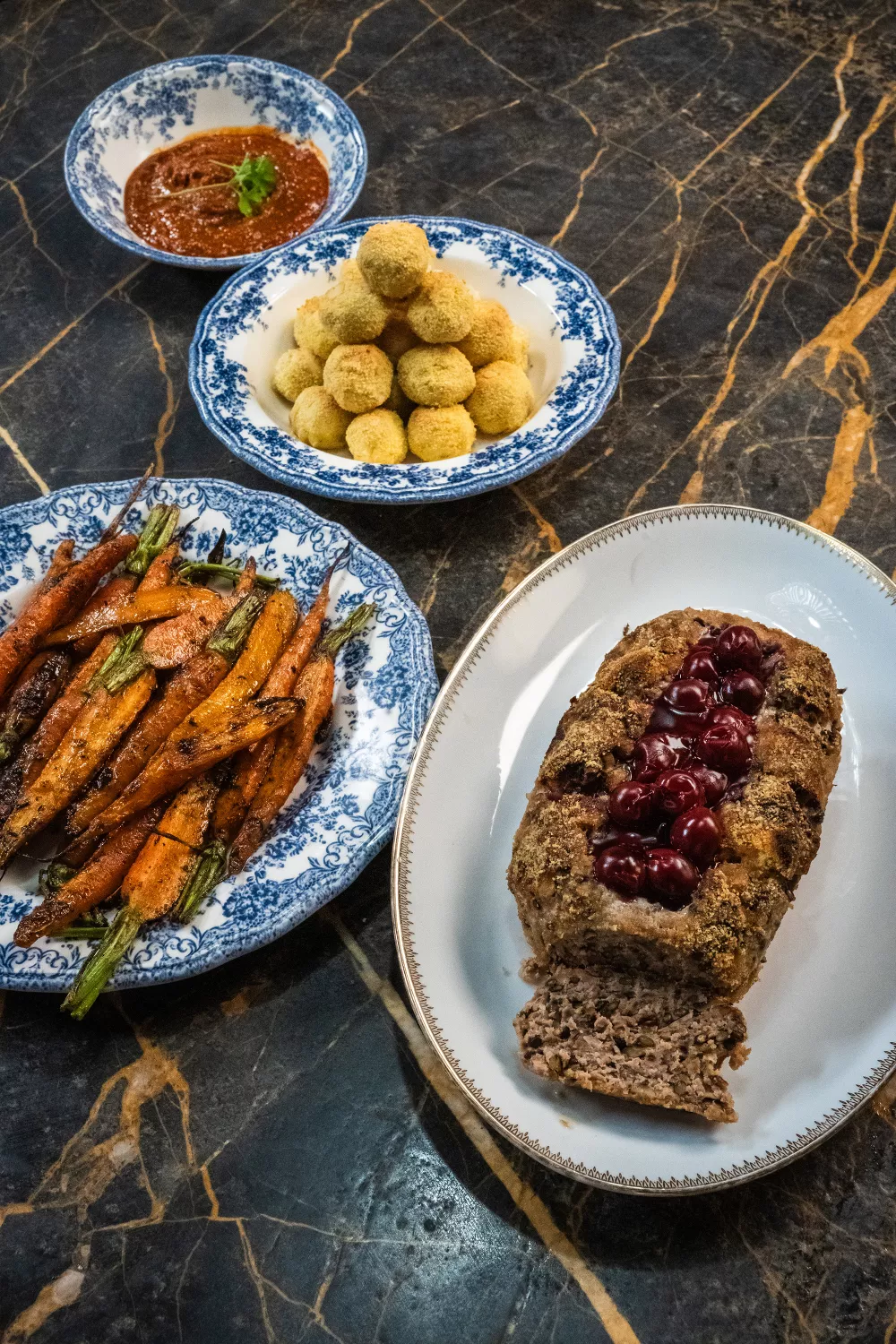 Vleesbrood van paddenstoelen met geroosterde wortelen en amandelkroketten