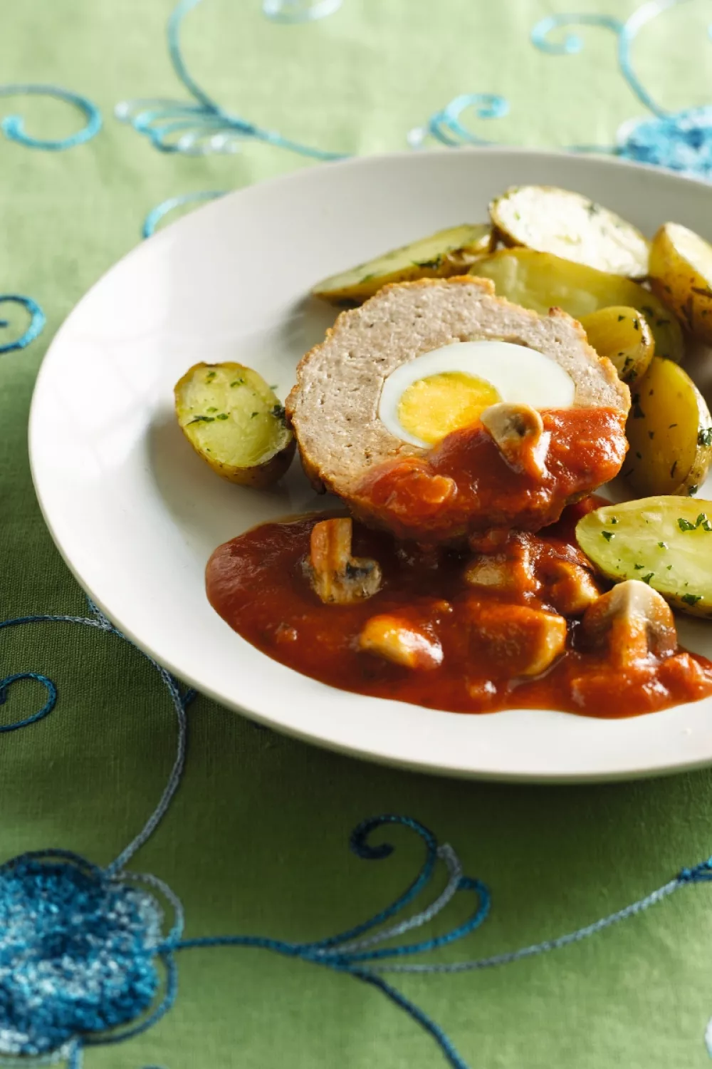 Snijd de gehaktballen doormidden, giet de tomatensaus errond en serveer met de gebakken aardappelen.