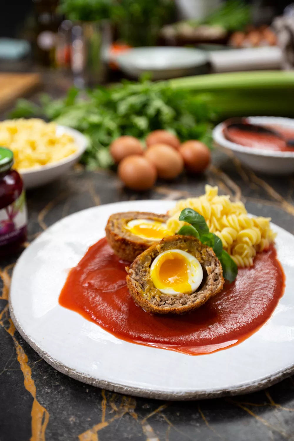 Knapperige vogelnestjes met een smeuïg hart van zachtgekookt ei brengen een verrassende mix van texturen en smaken: goudbruin paneerwerk rond gekruid gehakt van varken en rund en een lopende dooier. Het vlees wordt gepaneerd en gefrituurd, de saus is een romige passata met rode biet en fijn gestoofde venkel voor een licht zoetzure toets. Perfect voor een feestelijk diner of een gezellige herfst of winteravond, geserveerd met pasta en verse basilicum.