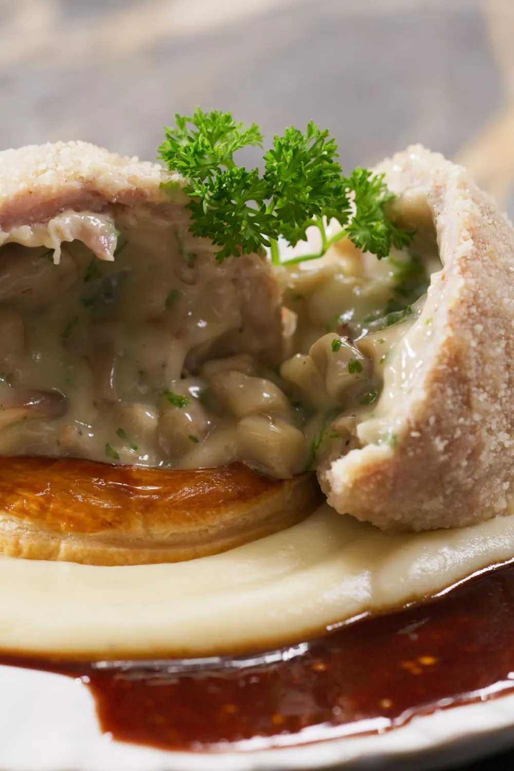 Deze hartige vol-au-bal combineert zacht konfijte kip, romige knolselderpuree en gebakken oesterzwammen in een rijke ragout die je in krokant bladerdeeg wikkelt. De bereiding vraagt langzaam garen van de kip in ganzenvet, een klassieke roux voor de saus en geroosterde groenten voor een diepe bruine jus, ideaal voor herfstige of feestelijke diners. Neem de tijd en je krijgt een huiselijke maar verfijnde hoofdschotel vol smaak en textuur.