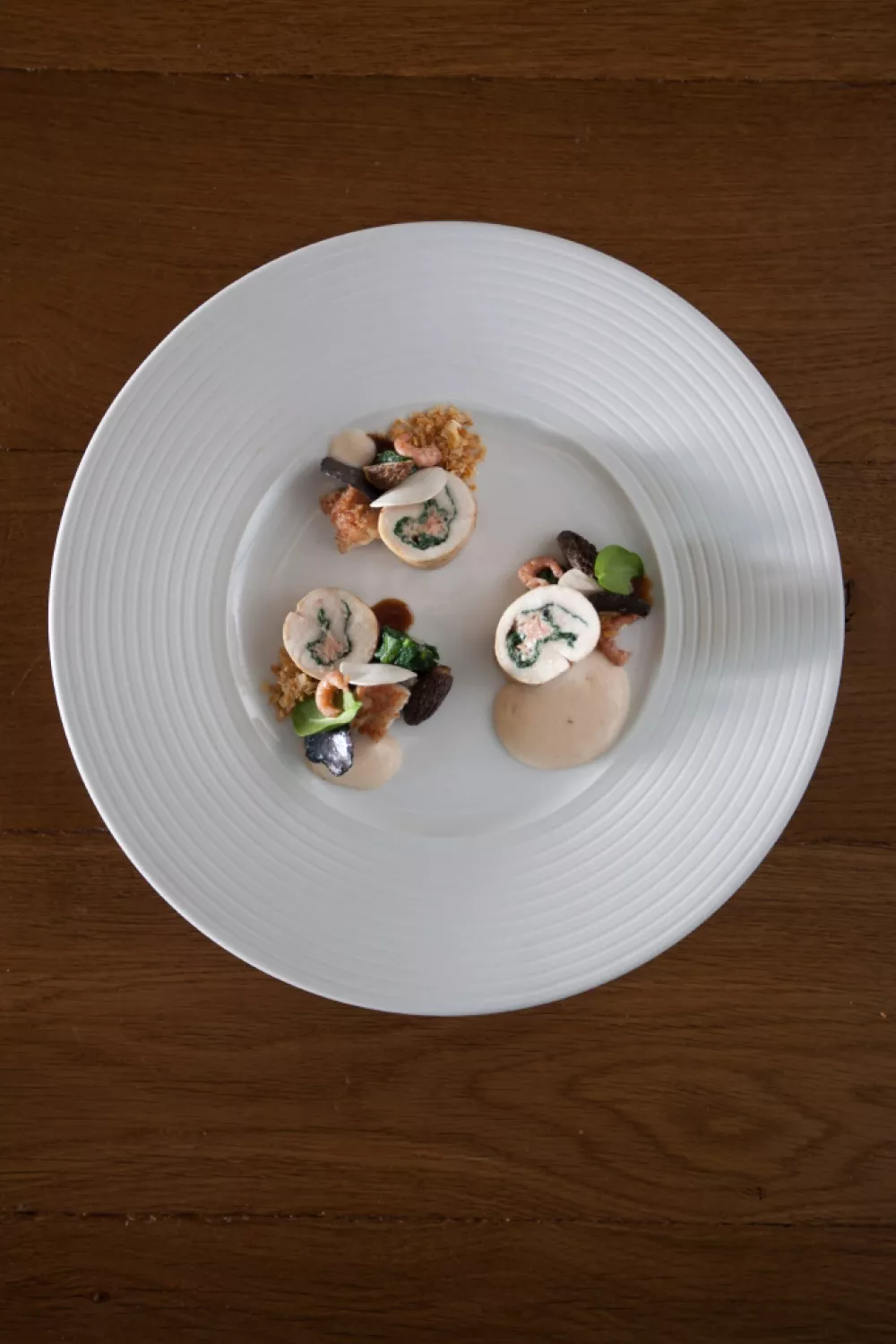 Versnijd de rollades in plakjes en verdeel ze over de borden. Schik er de zwezerik, spinazie, trompetten en crumble tussen. Verdeel de garnalen, schijfjes champignons, blaadjes spinazie en plakjes truffel erover. Werk af met kervelblaadjes en spuit er dotjes crème tussen. Lepel de jus erbij.