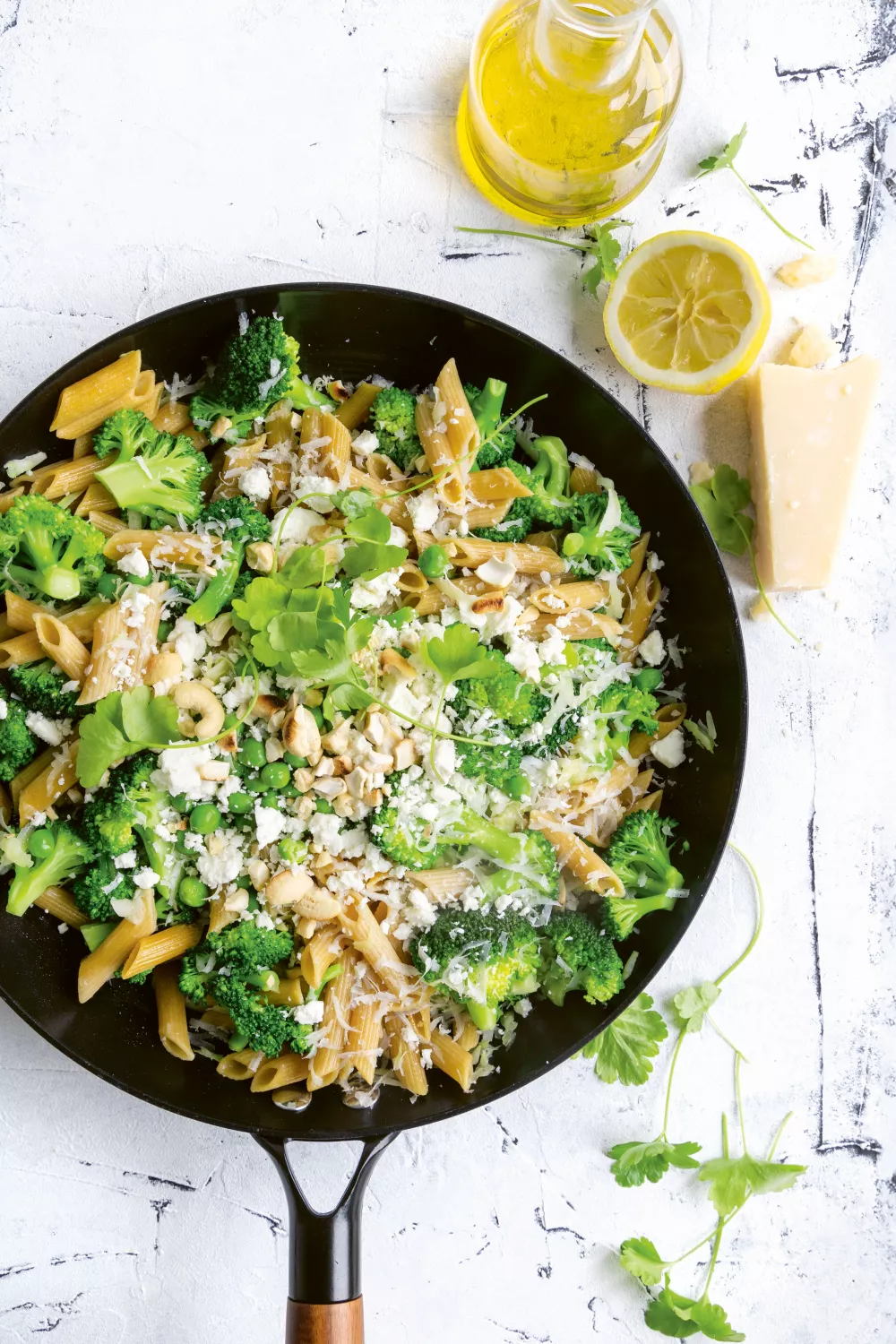 Volkoren penne met broccoli en erwtjes is een snel en gezond eenpansgerecht boordevol frisse citroen, kruidige peterselie en koriander en romige geitenkaas of feta. De broccolistam wordt gestoofd met knoflook, de roosjes kort gekookt en alles samen met de pasta gehusseld tot een glanzende, smaakvolle maaltijd. Afgewerkt met geroosterde cashewnoten en Parmezaan is dit recept ideaal voor een doordeweekse avondmaaltijd of lichte lunch in lente en zomer.