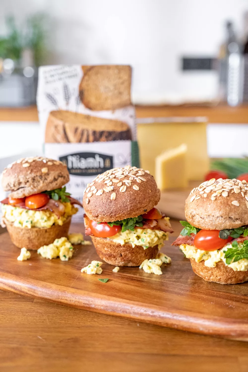Deze volkoren sandwiches met krokant spek en smeuïg roerei combineren hartige smaken en rustieke texturen tot een royaal ontbijt- of brunchgerecht. Het meergranen deeg wordt kort gekneed en ruim laten rijzen voor luchtige bolletjes die in een muffinvorm goudbruin bakken. Gesmolten gruyère, frisse bieslook en zoete kerstomaatjes maken het af en geven een gezellige, huisgemaakte touch.
